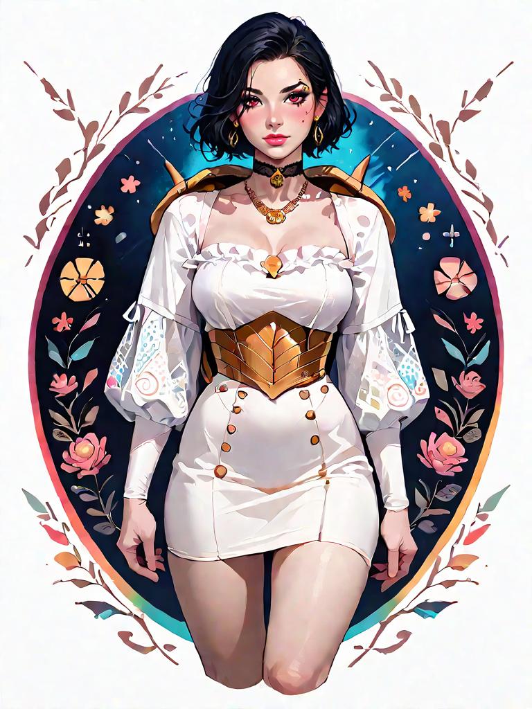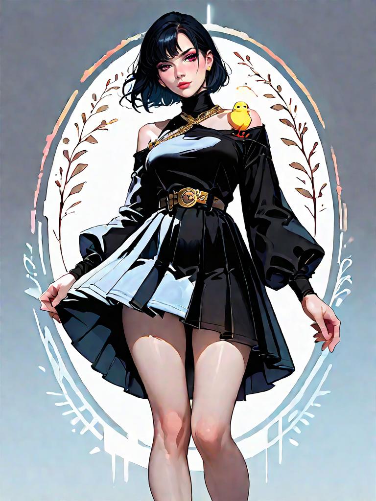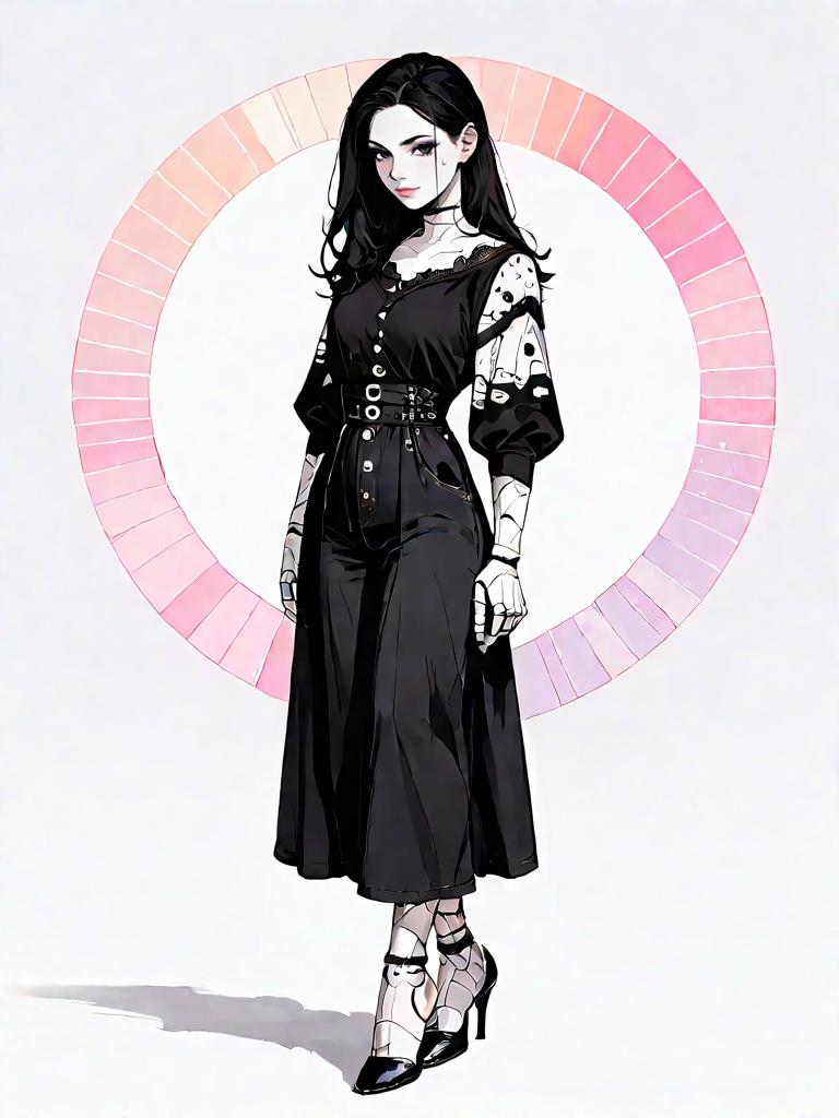 Digital artwork of a young woman with black hair styled in a bun, wearing a knee-length black A-line dress featuring brown floral patterns and a Peter Pan collar. She accessorizes with black heeled sandals with ankle straps and a choker necklace. The illustration combines elements of realism and comic art style with a minimalistic floral background and a circular halo effect behind the subject.