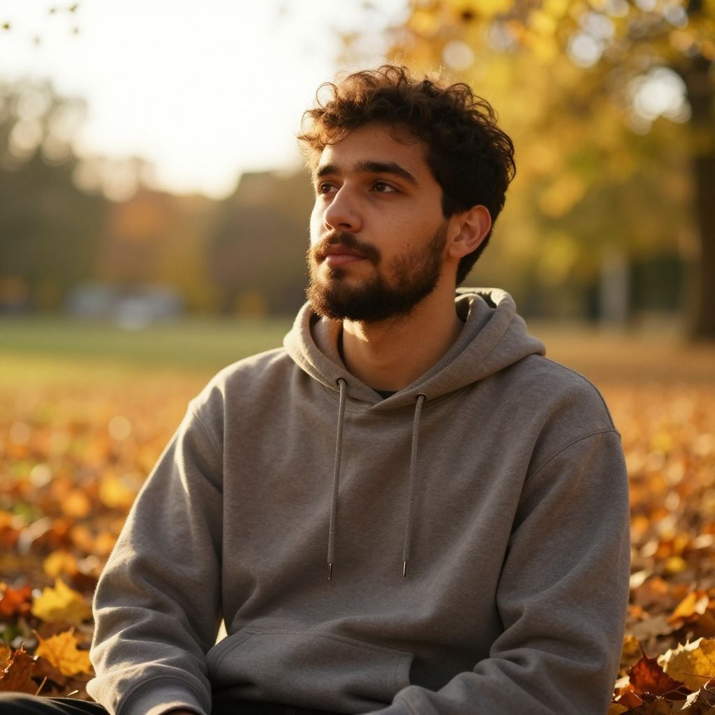 Photograph of a young man with medium brown skin, dark curly hair, and a short beard, sitting on the ground amidst a blanket of autumn leaves. He wears a light gray hoodie with white drawstrings. His eyes are brown and he gazes off to the right with a slight smile. The sunlight casts a warm glow on his face and the surrounding leaves, which are various shades of orange, yellow, and brown. The background is slightly blurred, emphasizing the subject. The overall mood is relaxed and contemplative.