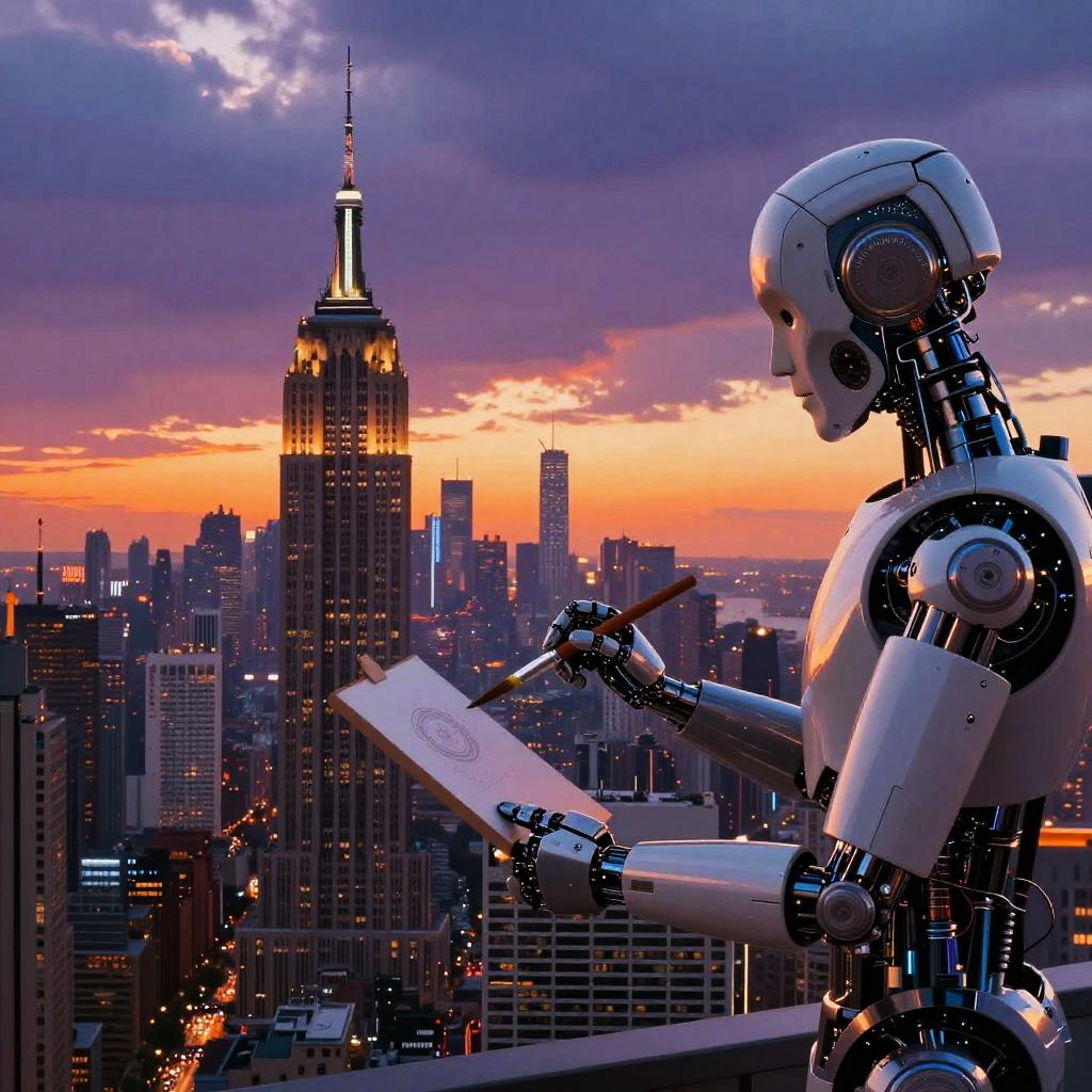 An AI drawings generator crafting dynamic urban landscapes at sunset, rich orange and purple tones, vivid details of skyscrapers and bustling streets, the AI system visualized as a sleek robotic artist with digital paintbrush, combining modern tech and artistic expression