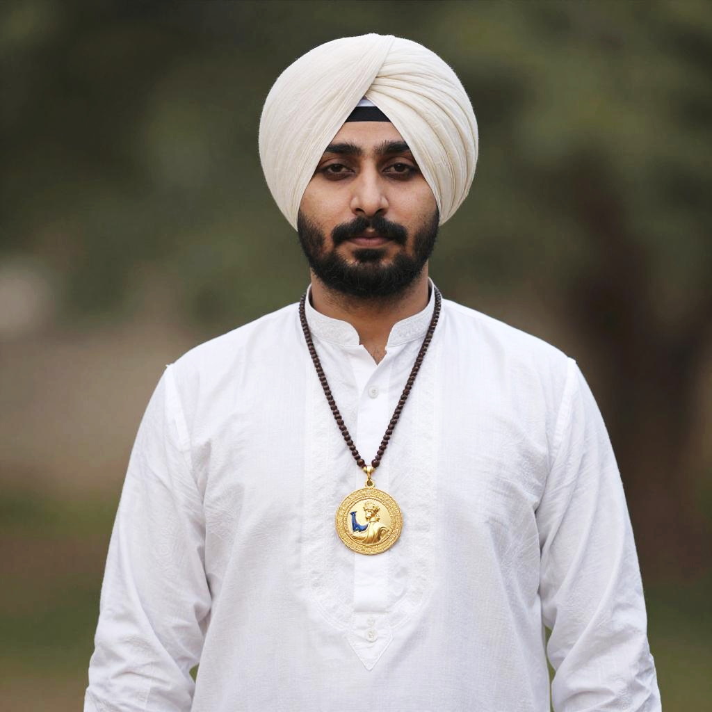 Portrait of a Sikh man wearing a white kurta and a white turban, complemented by a necklace with a gold medallion. The subject has a beard and mustache, standing against a blurred architectural background that suggests a traditional setting.