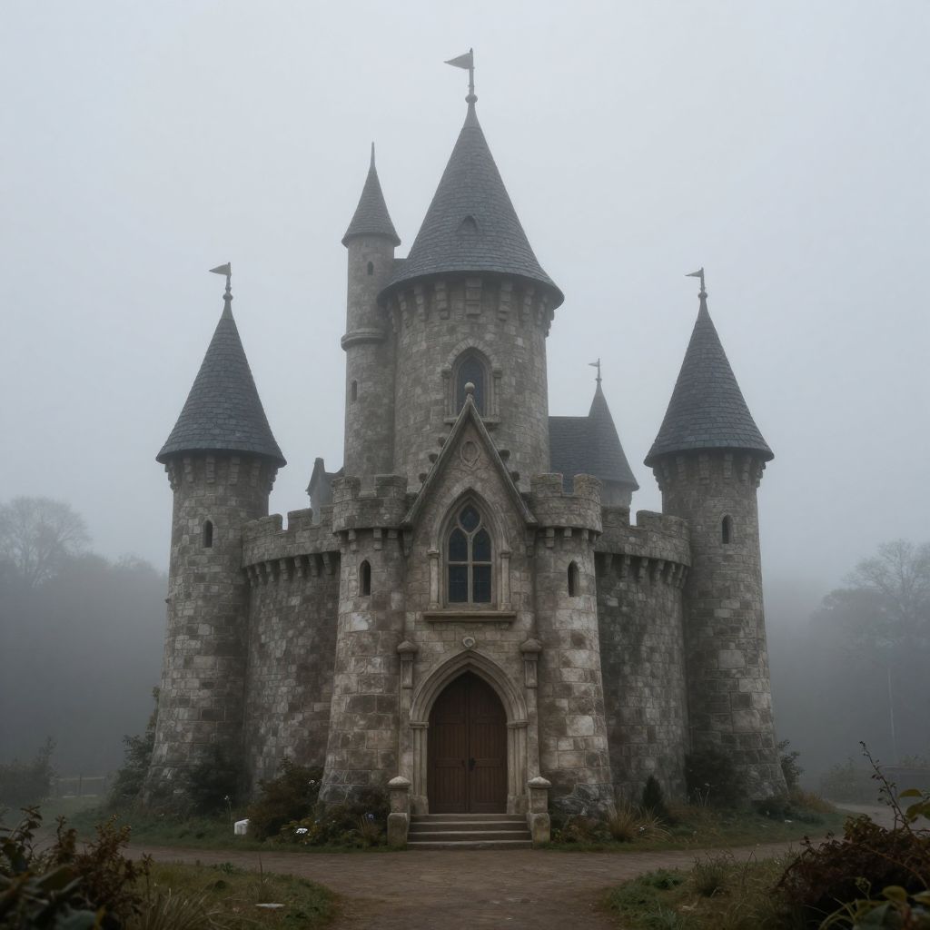 Photograph of a Gothic-style castle set in a foggy, forested area. The castle, constructed from gray stone, features three tall, conical turrets with dark gray, shingled roofs. The central turret is slightly taller than the others, with a small flag at its peak. The main entrance is a large, arched wooden door with a pointed arch window above it. The stone walls are textured and weathered, adding to the medieval ambiance. A narrow, cobblestone path leads to the entrance, flanked by sparse, mist-covered bushes. The background is shrouded in dense fog, obscuring the trees and adding a mysterious, eerie atmosphere to the scene.
