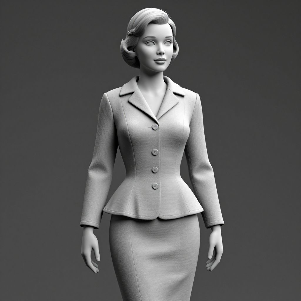 This is a CGI-rendered image of a stylized, monochromatic female mannequin. The woman has a smooth, polished appearance with a short, wavy hairstyle. She is wearing a tailored, buttoned blazer with a slightly flared lapel over a form-fitting skirt. The blazer has two visible buttons and the fabric has a subtle, textured pattern. The background is a simple, dark gradient, emphasizing the figure. The mannequin's facial features are soft and slightly exaggerated, with a serene expression. The overall style is reminiscent of mid-20th century fashion illustrations, with a modern, digital twist.