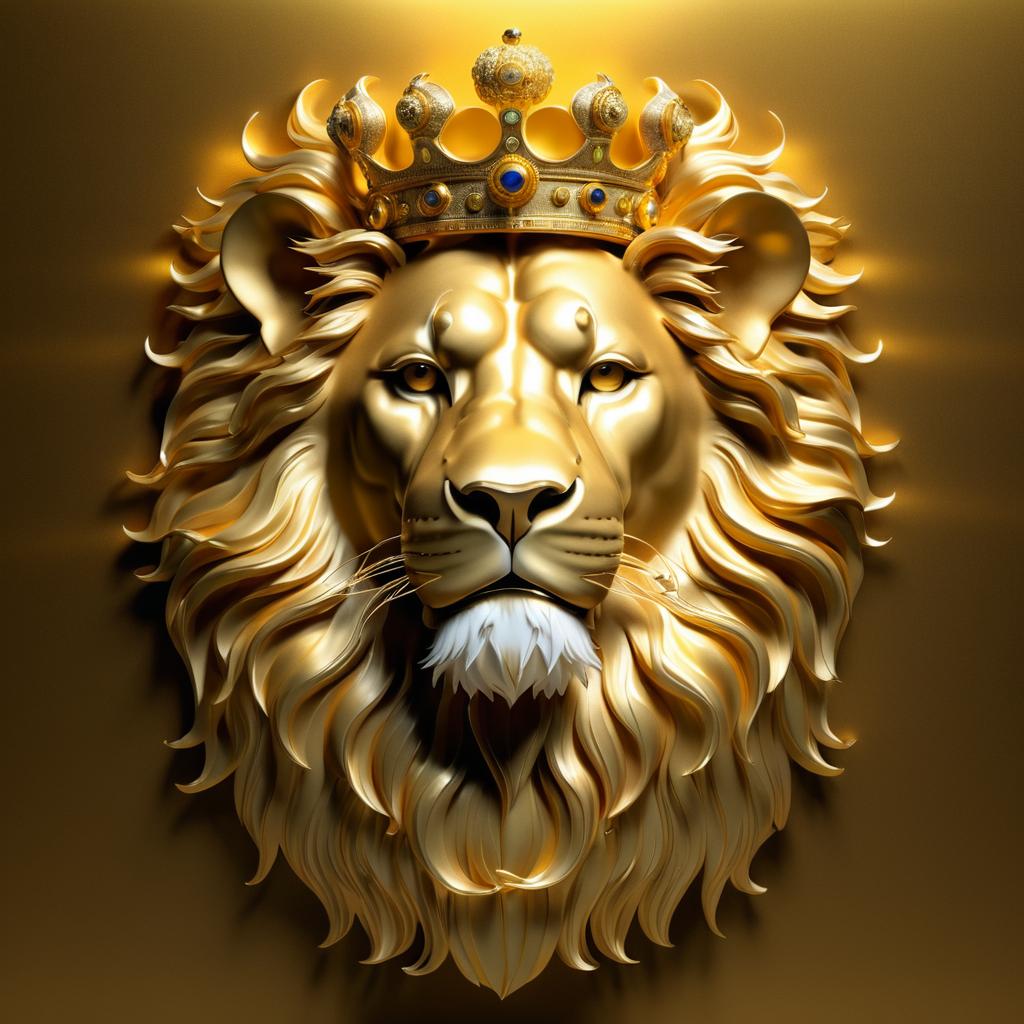 Hyperrealistic portrait of a majestic lion wearing an ornate golden crown, inspired by the styles of Gustav Klimt, James Jean, and Yoshitaka Amano. The lion's flowing mane and detailed fur are rendered with volumetric lighting, highlighting intricate textures and a regal expression. The background features decorative golden patterns enhancing the luxurious and powerful mood of the image.