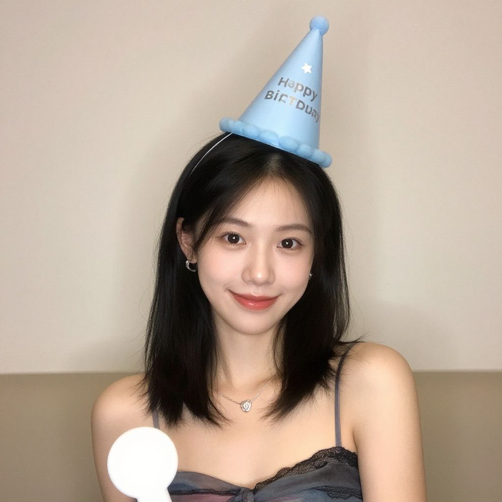 Photograph of an East Asian woman with straight black hair, wearing a light blue, cone-shaped birthday hat that reads "HAPPY BIRTHDAY" in black text. She has fair skin, small hoop earrings, and a simple silver necklace with a round pendant. She is dressed in a black, spaghetti-strap top. The background is a plain, light-colored wall with a beige headboard partially visible at the bottom. The image has a white circular overlay in the bottom left corner. The woman is smiling softly at the camera.