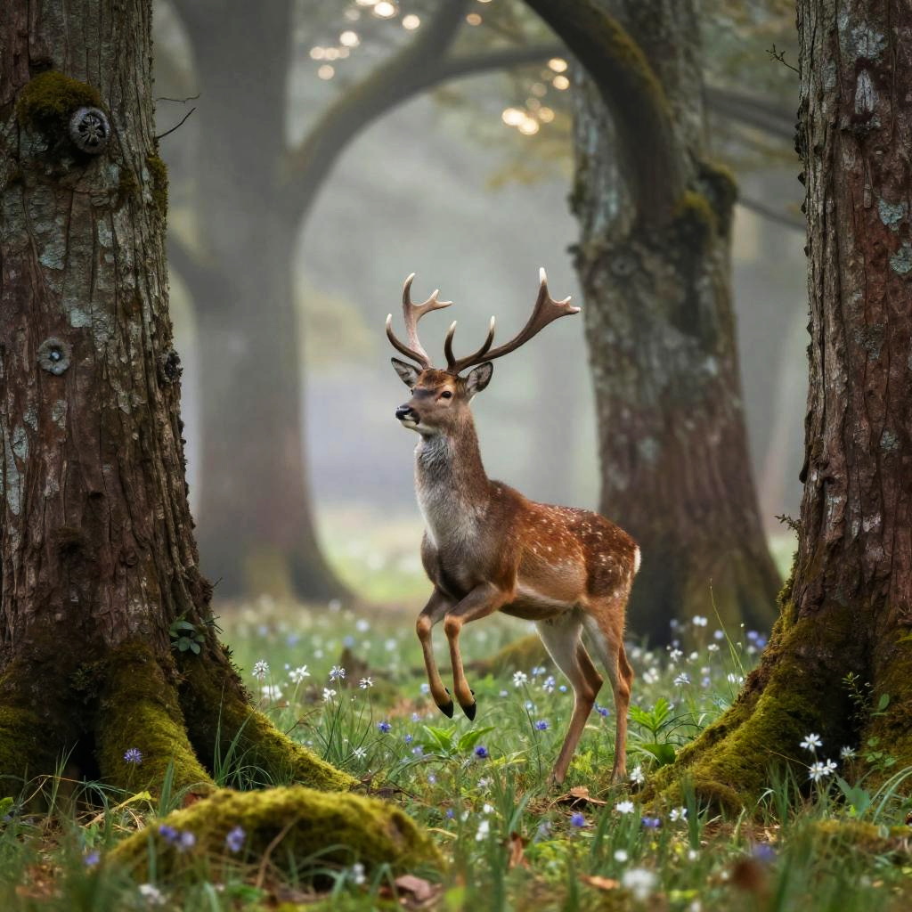Deer on its hind legs in a misty enchanted forest, dappled sunlight filtering through ancient towering trees, with vibrant green moss and delicate wildflowers surrounding, creating a magical and serene atmosphere.