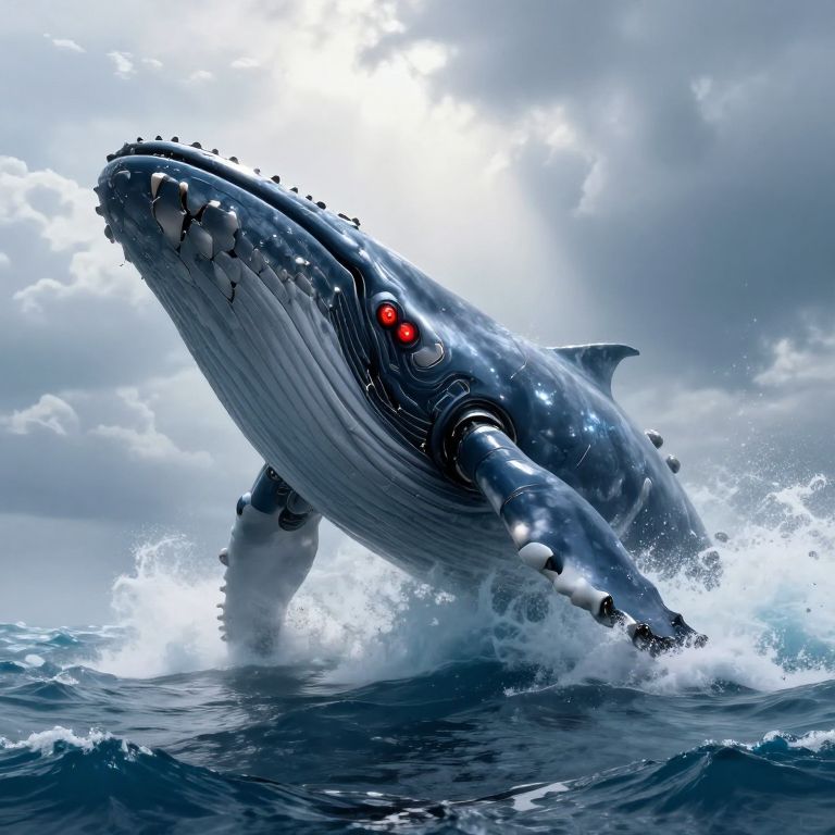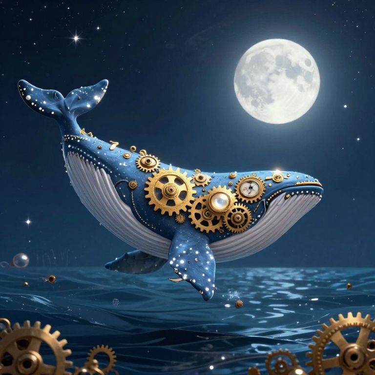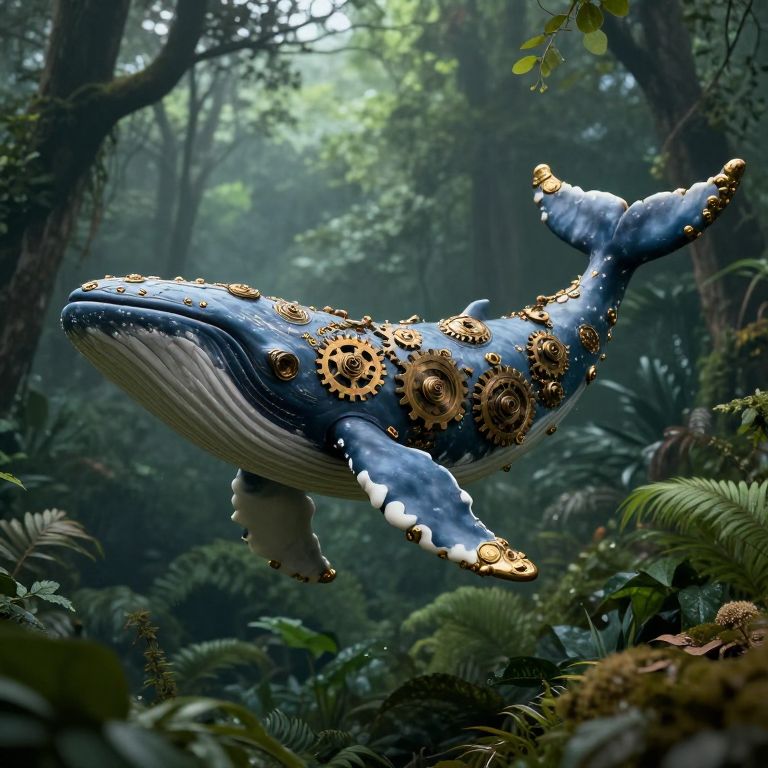 In a mesmerizing cyberpunk-inspired 3D render, a colossal clockwork whale, adorned with intricate gears and glowing emerald eyes, swims gracefully yet upside-down through a sunlit subterranean cavern, its mechanical appendages slowly unspooling the enigmatic fabric of time beneath a dramatic interplay of light and shadow.
