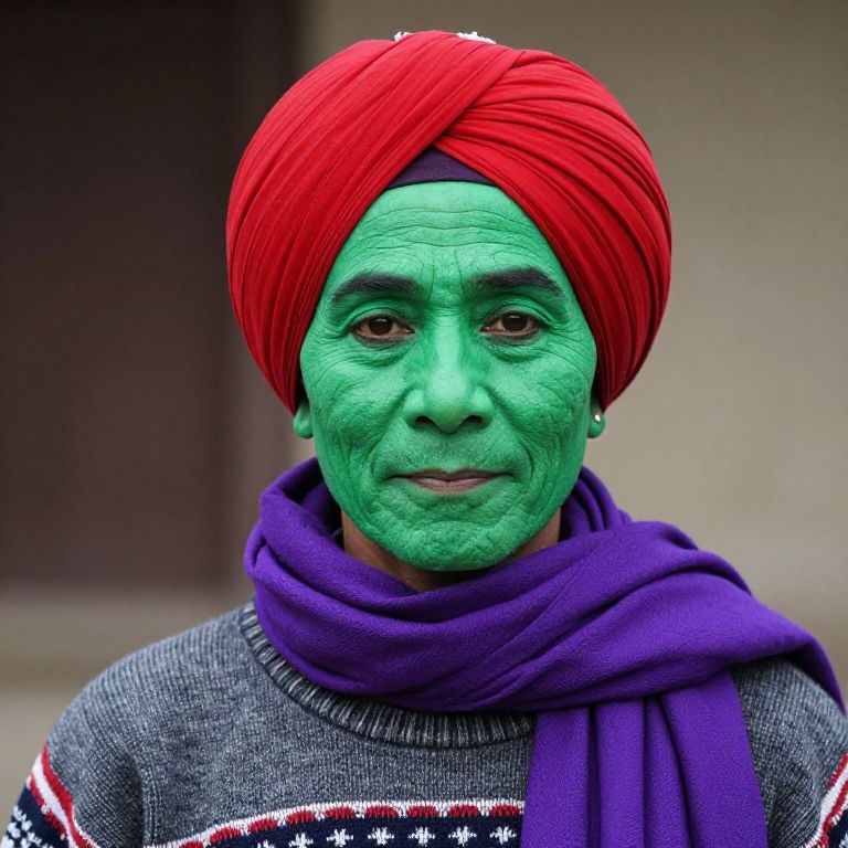 A person with a green face and a red turban on their head. The person is wearing a purple scarf around their neck and a gray sweater with a pattern on it.