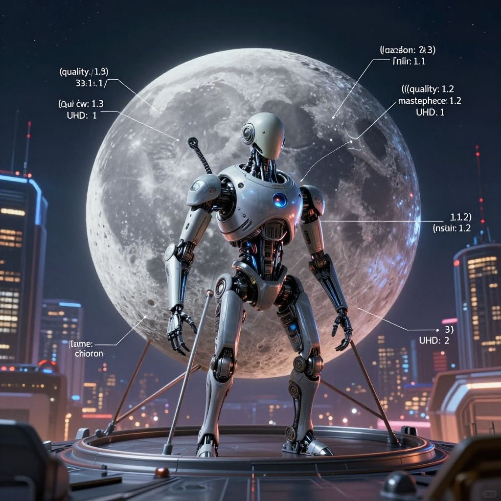 Digital art: metallic robot with glowing blue eye stands on a platform against a large moon, surrounded by a futuristic cityscape at night. Detailed annotations highlight