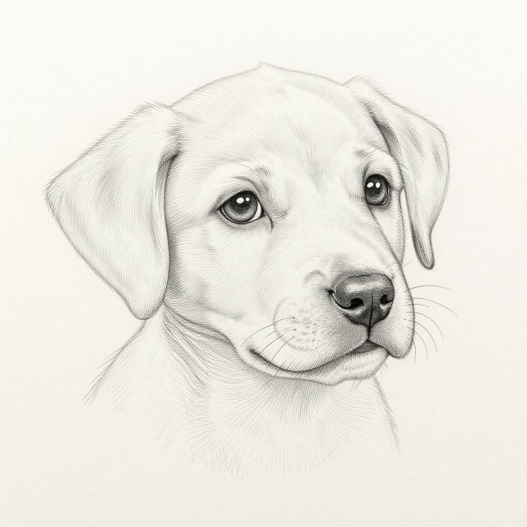 Puppy line art, detailed linear portrait of a curious puppy headshot, careful use of cross-hatching and clean lines, artistic pencil sketch feel, monochromatic with soft shading, stylish and elegant