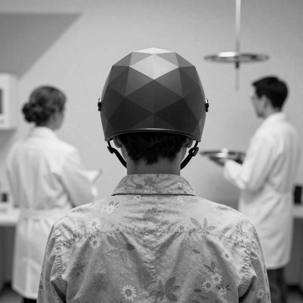 Black and white photograph showing the back view of a person wearing a geometric 3D-patterned helmet and a floral button-up shirt. In the background, a woman in a white lab coat holds a tray on the left, and a man stands on the right in a modern clinical environment with geometric wall patterns.