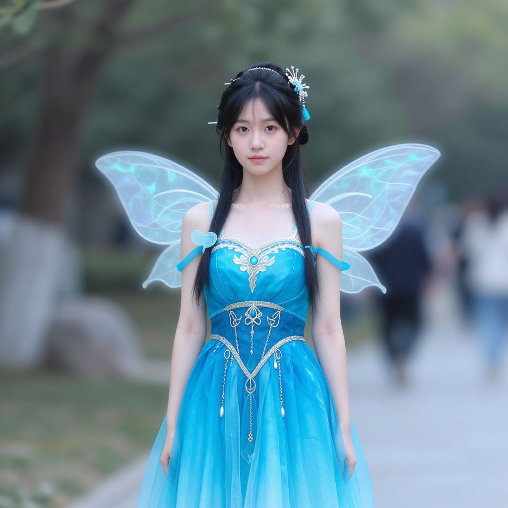 Peacock fairy costume, 1girl, solo, dress, blurry background, blurry, blue dress, black hair, looking at viewer, realistic, hair ornament