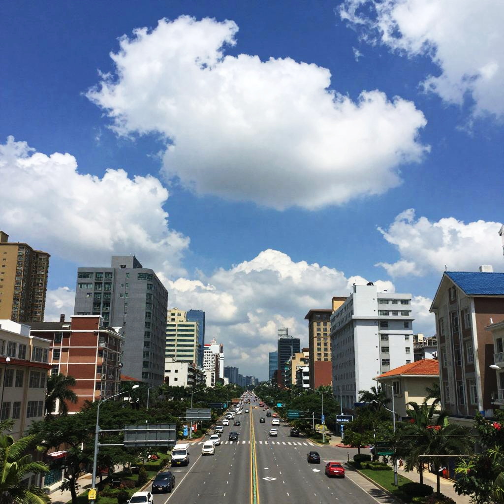 Photograph of a city street captured from an elevated perspective, showing a symmetrical view down the road lined with modern buildings on both sides. The sky is bright blue with large, fluffy white clouds. Buildings vary in height and style, including high-rises and shorter structures with red and blue rooftops. The street is wide with two yellow lines down the center, and a few cars, including a red one, are parked along the sides. Green trees and small bushes line the sidewalks, adding a touch of nature to the urban setting. The overall scene conveys a vibrant, sunny day in a bustling city.