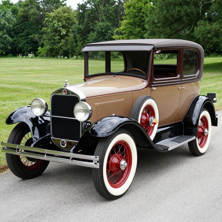 Photograph of a vintage 1920s-era car, parked on a gravel road in a lush, green park. The car has a two-tone paint job with a brown body and black roof. It features large, red-spoked wheels with white tires, and black fenders. The front has a prominent chrome grille and dual round headlights. The car's body is sleek and boxy, with a small windshield and side windows. The background includes a grassy field and dense trees, creating a serene, natural setting. The car's classic design and well-maintained condition highlight its historical significance and elegance.