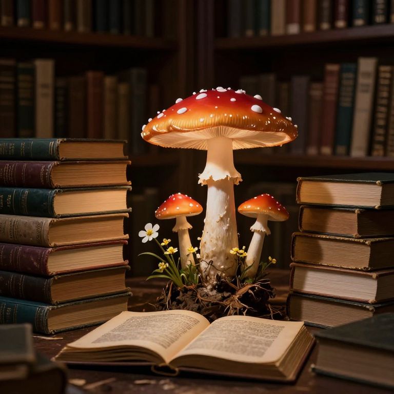 In a dimly lit library where ancient wisdom whispers to the shadows, vibrant mushrooms emerge from stacks of books, symbolizing the eternal growth of knowledge and the magical rebirth of forgotten memories, while delicate flowers bloom amidst the pages, hinting at the tender beauty of discovery and the quiet serenity of learning.