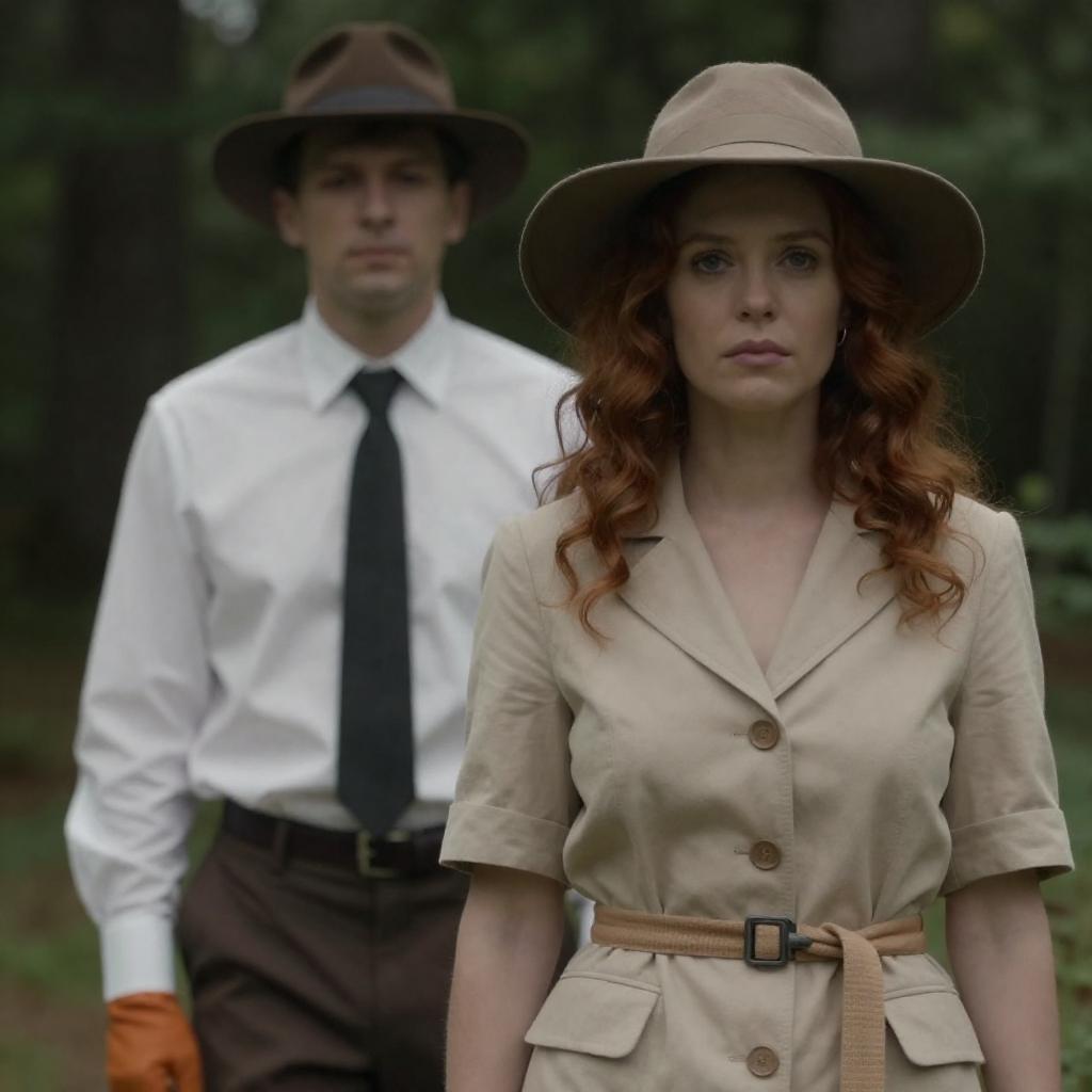 Photograph of two people in vintage attire standing in a forest. The woman in the foreground wears a beige, belted, short-sleeved jacket with orange gloves, and a wide-brimmed hat. She has curly red hair and a serious expression. The man in the background wears a white shirt, black tie, and brown hat, with a neutral expression. The background is dark and forested.