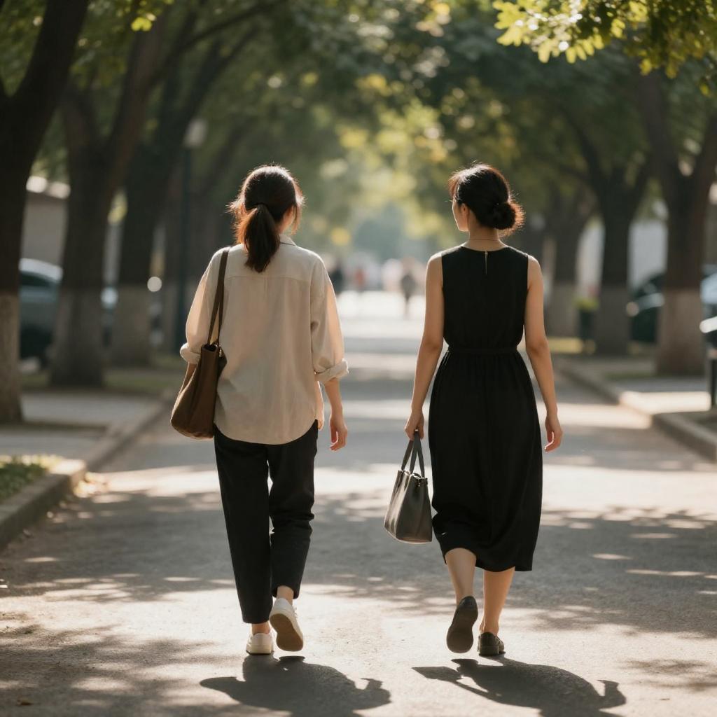 Photograph of two women walking on a sunlit, tree-lined path. The woman on the left has light brown hair in a ponytail, wears a beige shirt and black pants, carrying a bag. The woman on the right has dark brown hair in a bun, wears a sleeveless black dress, and carries a gray bag. Shadows from trees create a dappled light effect on the path.