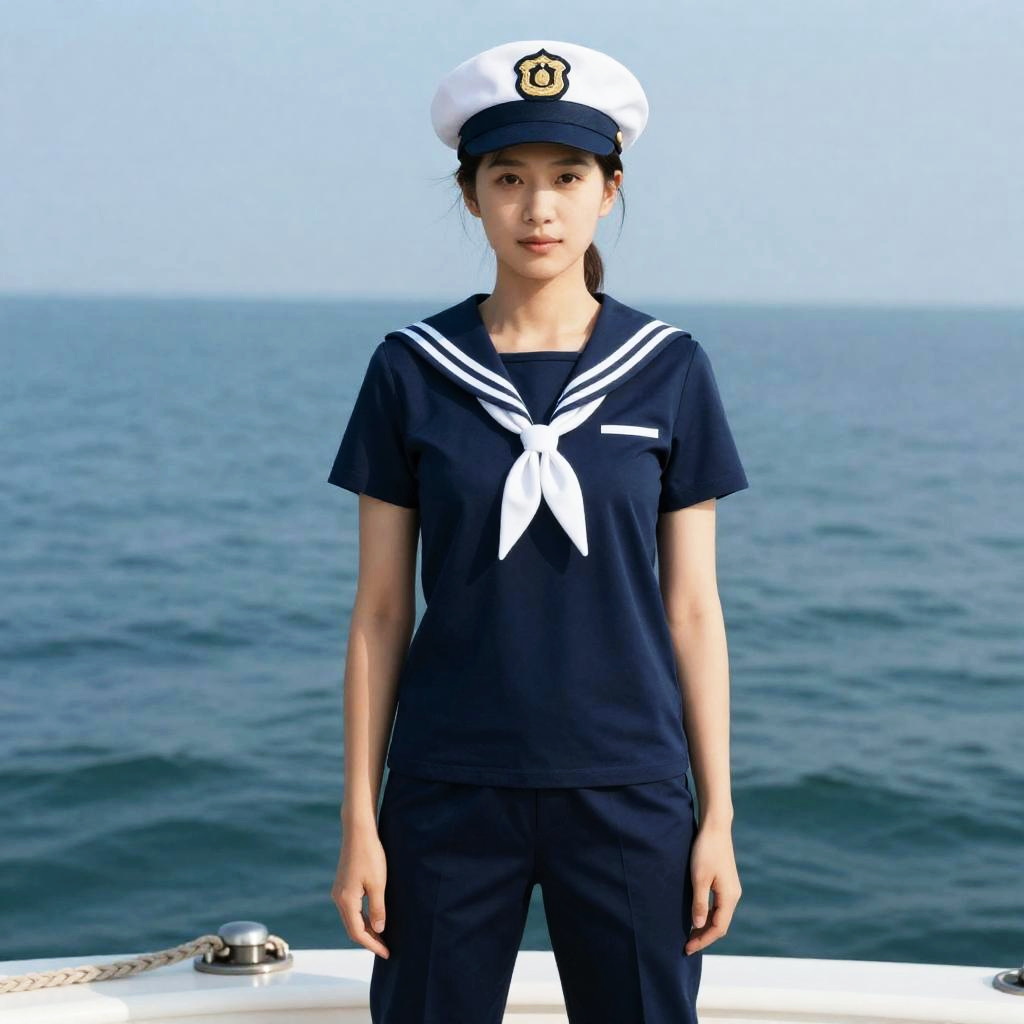 Captain Navy Costume Tee Woman, woman in a navy uniform standing on a boat in the water