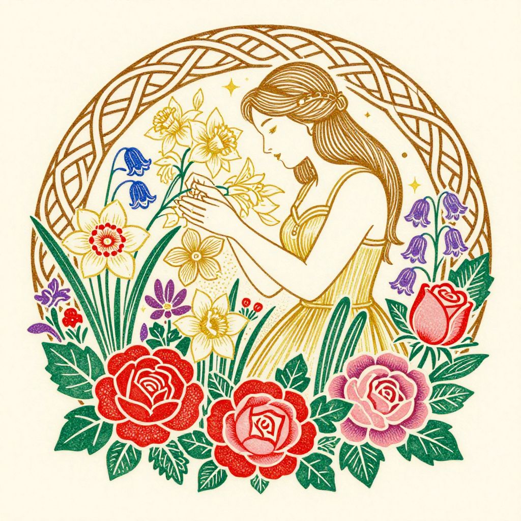 Artistic illustration of a woman with long brown hair, wearing a yellow dress, gently picking flowers within a circular woven frame, surrounded by vibrant red,