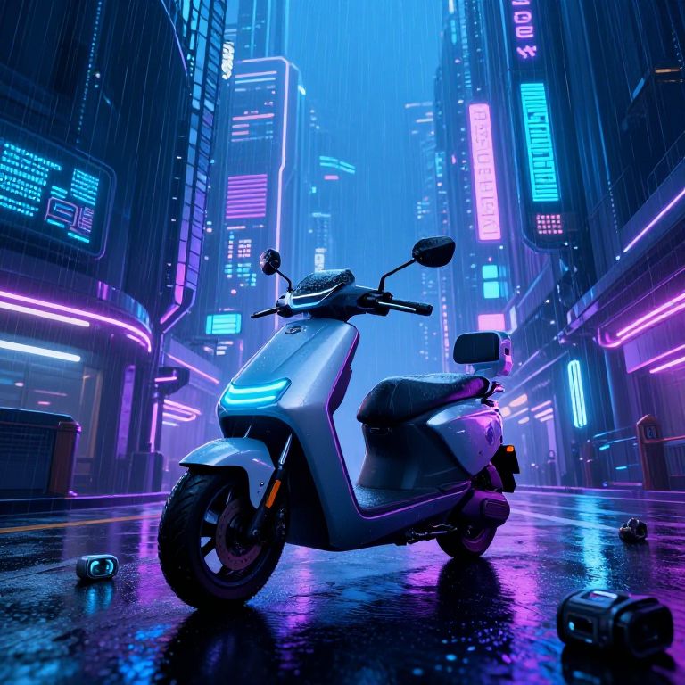 Neon-lit cyberpunk city street at night with a silver scooter parked on wet pavement, surrounded by glowing blue and purple signs. Photorealistic