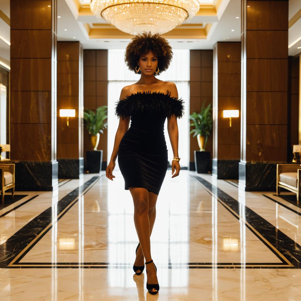 Strapless black feather-trim bodycon cocktail dress on medium-toned woman with curly afro hair posing walking forward mid-step looking at camera in luxury hotel lobby with marble floors, golden hour backlighting with gentle glow, fashion editorial photography, full body, high resolution, ultra-detailed, 4k