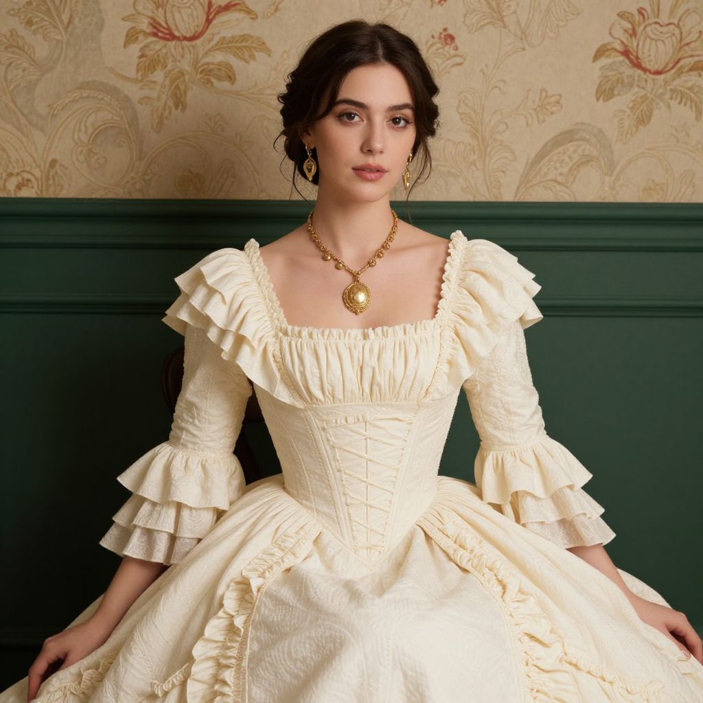 Photorealistic image of a young woman with fair skin and dark hair, wearing a cream-colored, ruffled, Victorian-style dress with gold necklace,