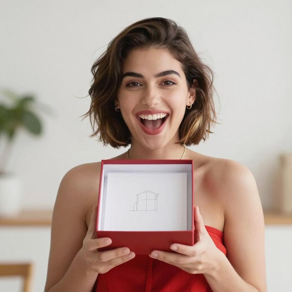 Photograph of a young woman with short, dark brown hair with blonde highlights, wearing a strapless red dress. She's smiling widely with her mouth open, holding a red box with a white interior and a small drawing inside. The background is blurred with a bright white and a hint of green from a plant. She's wearing small earrings and a thin necklace.