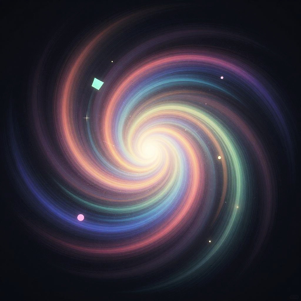 Digital illustration of a vibrant, swirling galaxy with colorful, spiraling rings of light, surrounded by small, glowing stars against a dark background.