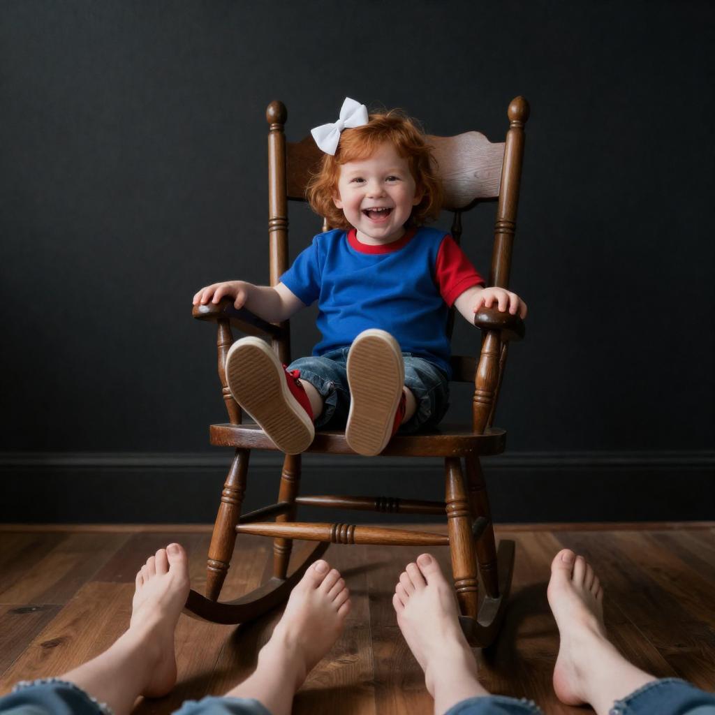 Photograph of a red-haired child in a blue and red shirt, sitting in an antique rocking chair with a joyful expression. Child's feet up, shoes with red straps. Two adult legs lying on wooden floor, feet bare. Rocking chair's curved handle on floor. Dark, ured wallpaper in background. Child wears a white bow on head.