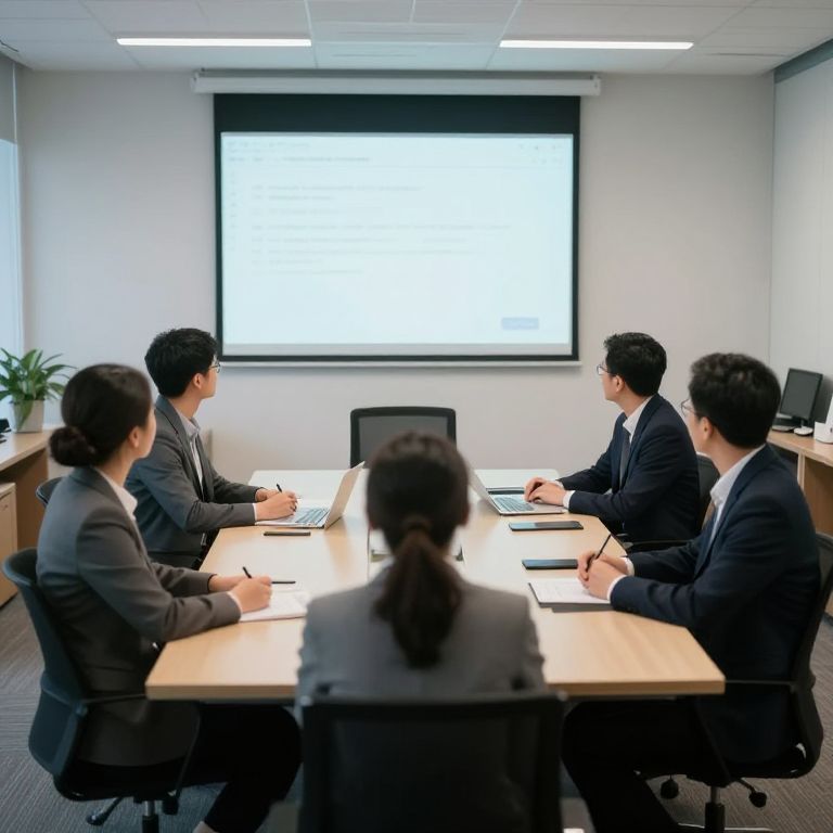 A well-organized business office during a team meeting, with professionals seated around a rectangular table, projecting slides on a screen, and a calm, productive atmosphere.