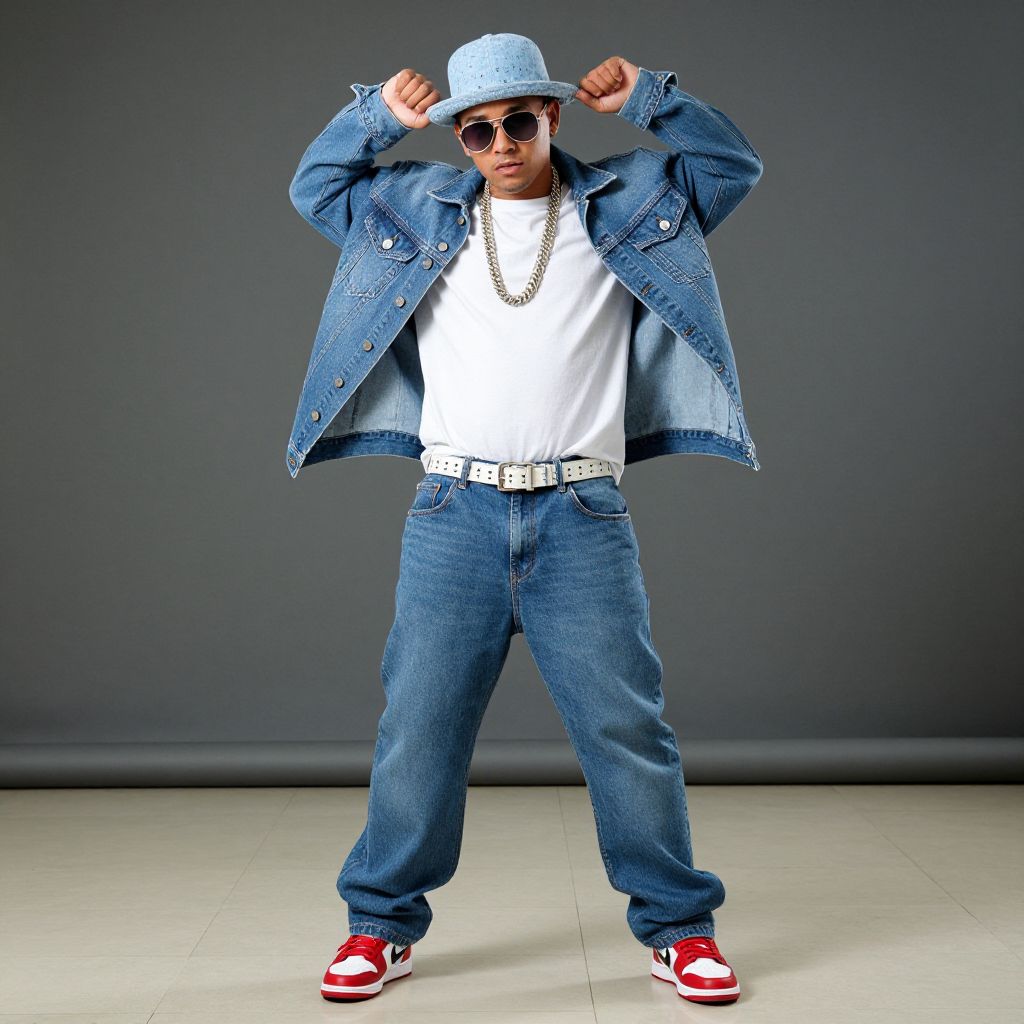 Hip hop dance outfit costume, male focus, 1boy, denim, solo, jacket, pants, jeans, hat, sneakers, shoes, red footwear, sunglasses, white shirt, shirt, full body, jewelry, belt, necklace, standing, open jacket, denim jacket, open clothes, looking at viewer, blue jacket, indoors