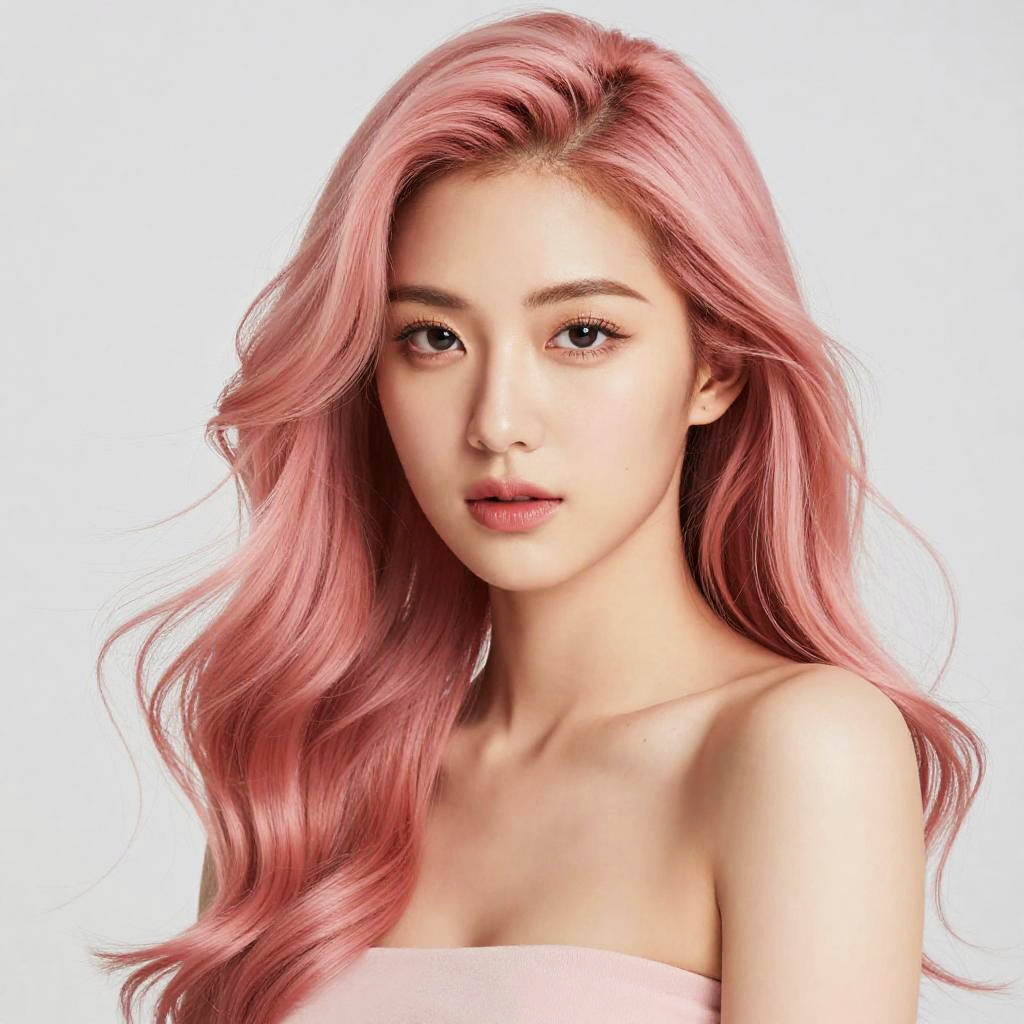 Photorealistic digital portrait of a young Asian woman with long, wavy pink hair, fair skin, and pink lips, wearing a strapless pink