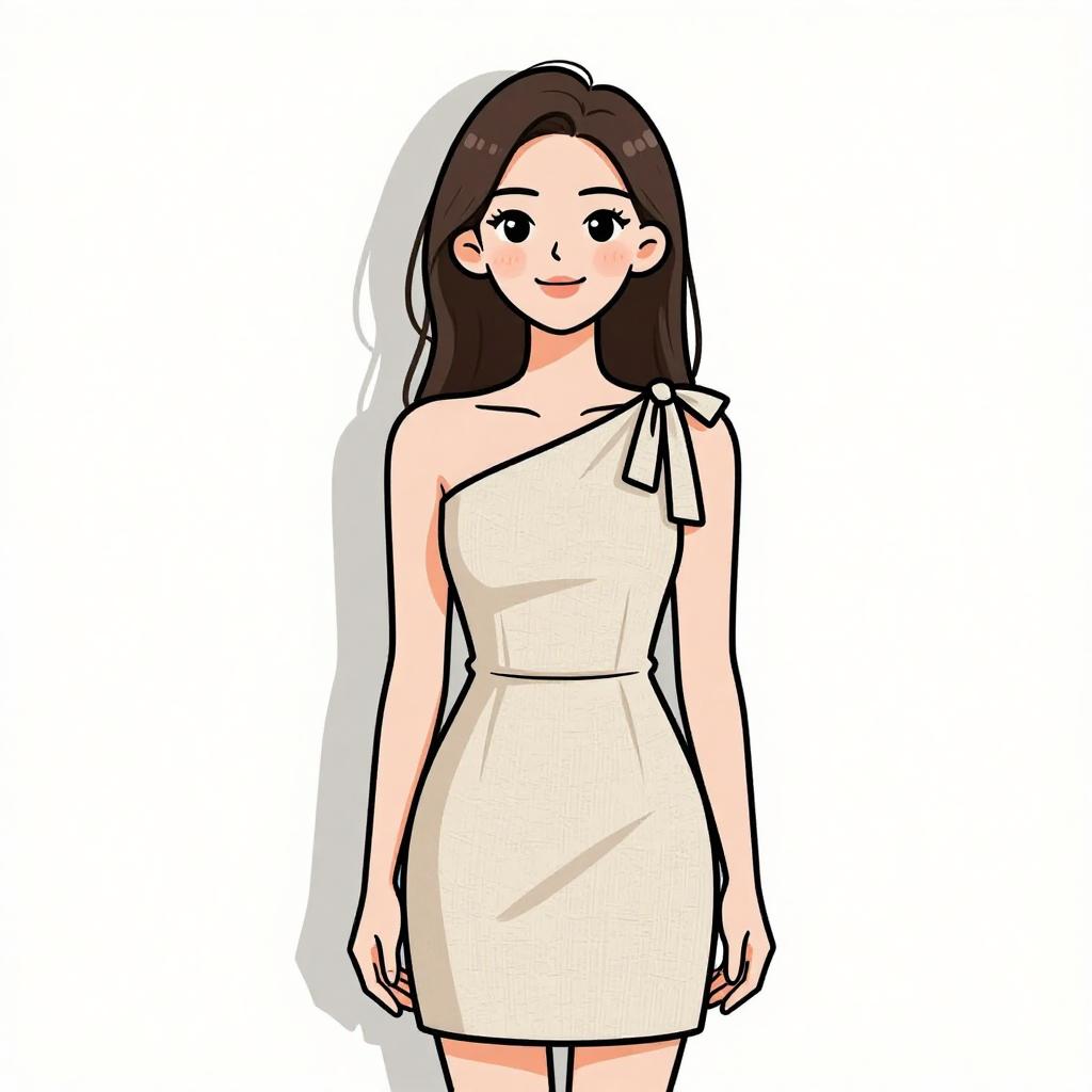 This digital anime-style drawing features a young woman with long, straight black hair, wearing a simple, sleeveless, V-neck cream-colored dress that falls above her knees. She has fair skin, large black eyes, and a slight blush on her cheeks. Her expression is gentle and welcoming. She also wears a thin black headband. The background is completely white, making the subject stand out. The drawing uses clean lines and bright colors, typical of modern anime art. The woman's pose is relaxed, with her right arm slightly bent and her left arm hanging by her side.