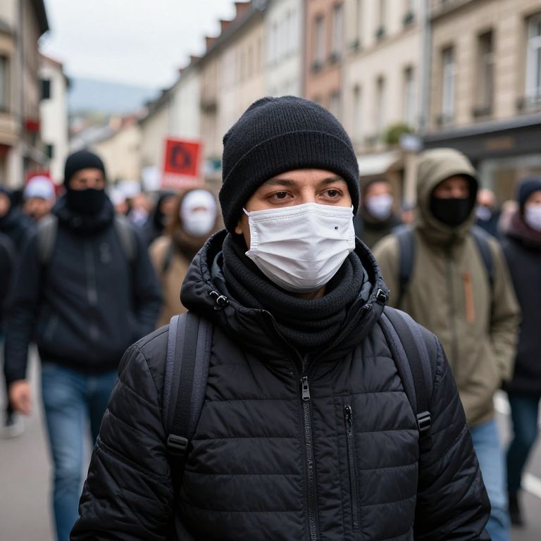 Foreground-Background Relationship protester in a street of Grenoble, masked, protesters in background - testp,