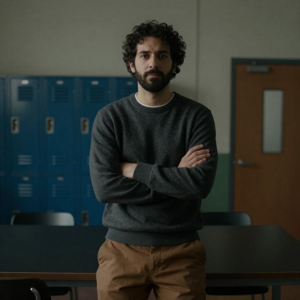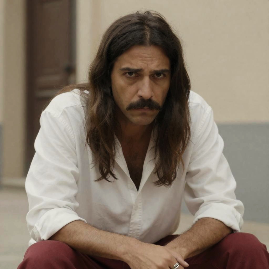 Portrait of a middle-aged man with dark hair, light skin, and a mustache, wearing a white prison uniform. He is seated in a blue metal-caged cell, looking directly at the camera with a neutral expression. The background features additional blue metal bars and a white tiled wall, suggesting a prison setting.