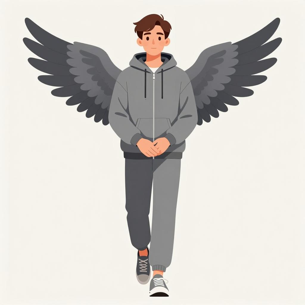Illustration of a young man with gray wings, wearing a gray zip-up hoodie and matching pants, walking forward. He has short brown hair and a neutral expression. His hands are clasped in front of him. He wears gray sneakers. The background is a plain, light beige color. The man is centered in the image.