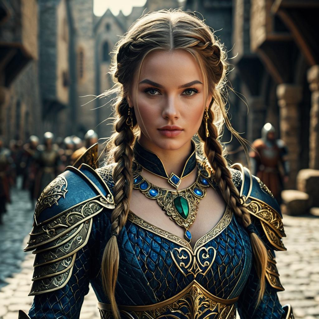 Photorealistic digital art of a beautiful fantasy female character with blue eyes and twin braids, dressed in dark blue and gold detailed armor featuring intricate patterns and a green gemstone necklace. The scene is set on a medieval street with soft warm sunlight, a blurred background of knights in armor, and an overall elegant and powerful atmosphere.