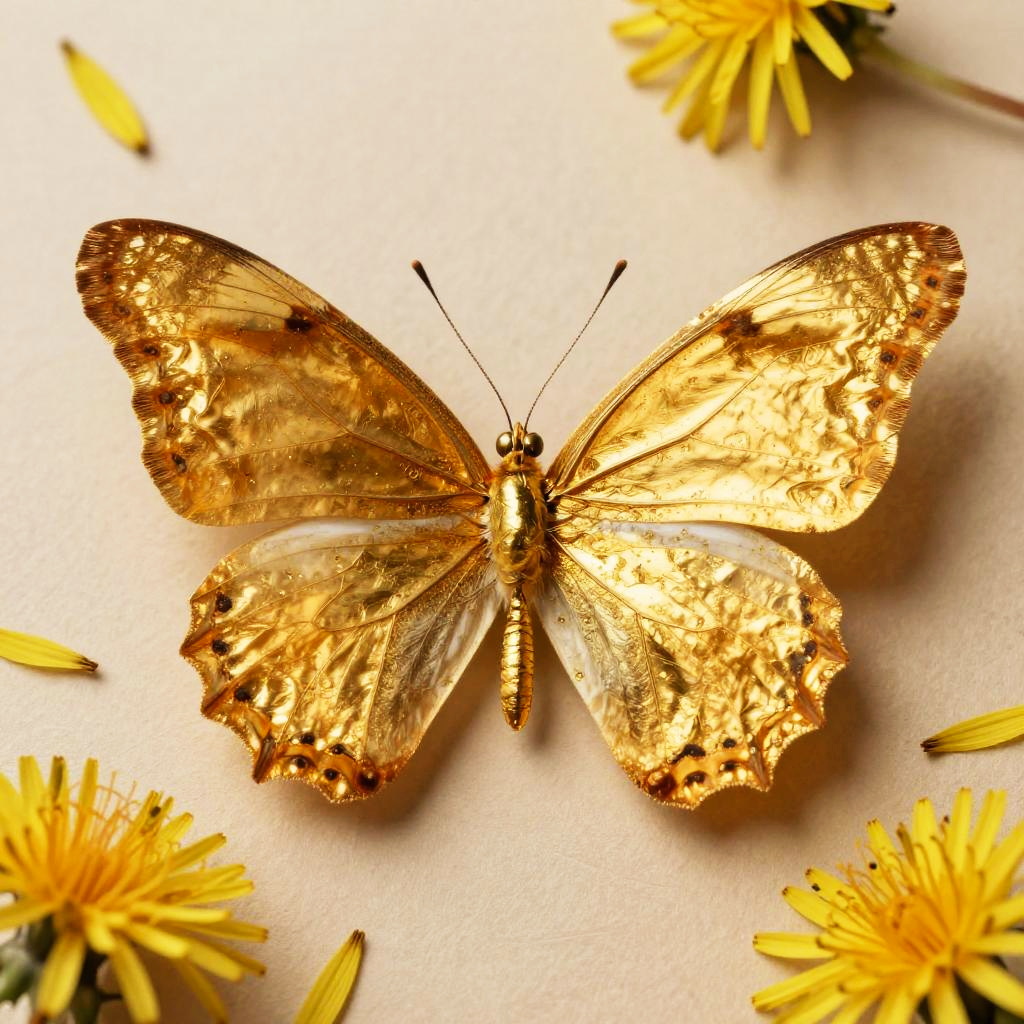 A realistic 12d image of a beautifully detailed golden majestic butterfly gently resting on a gleaming amber handmade rice paper symbolizing personal growth and self-love. The background is filled with faint yellow dandelion petals representing the blossoming of one's self-worth. Dimensions: 6 x 9 inches