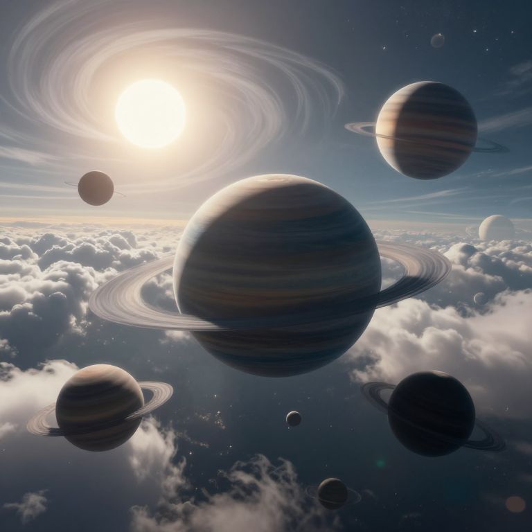 A surreal cosmic landscape unfolds as planets of varying sizes float serenely against a backdrop of swirling clouds and a radiant sun, defying gravity and creating an otherworldly ballet of celestial bodies.