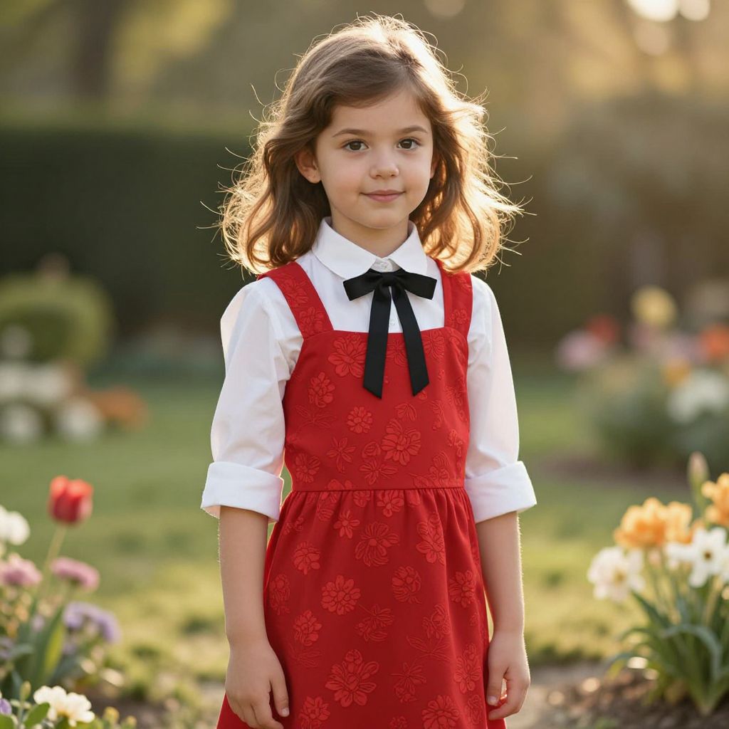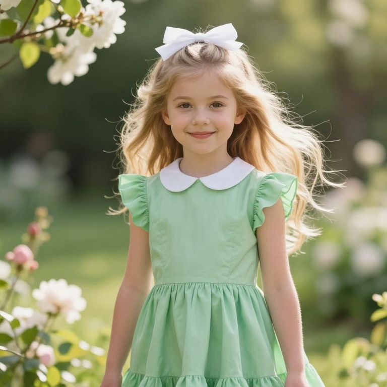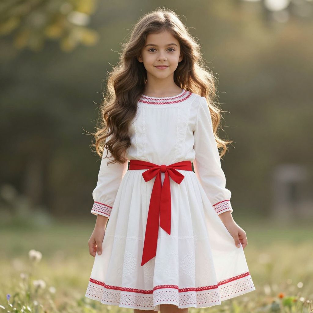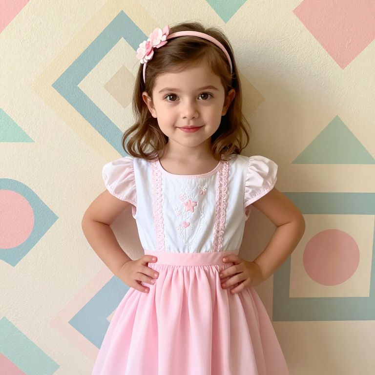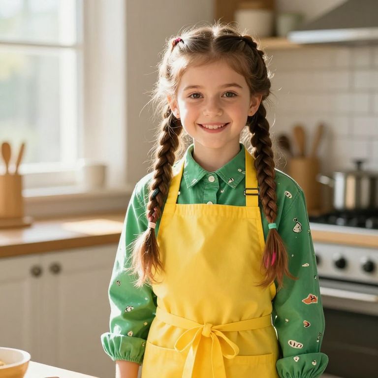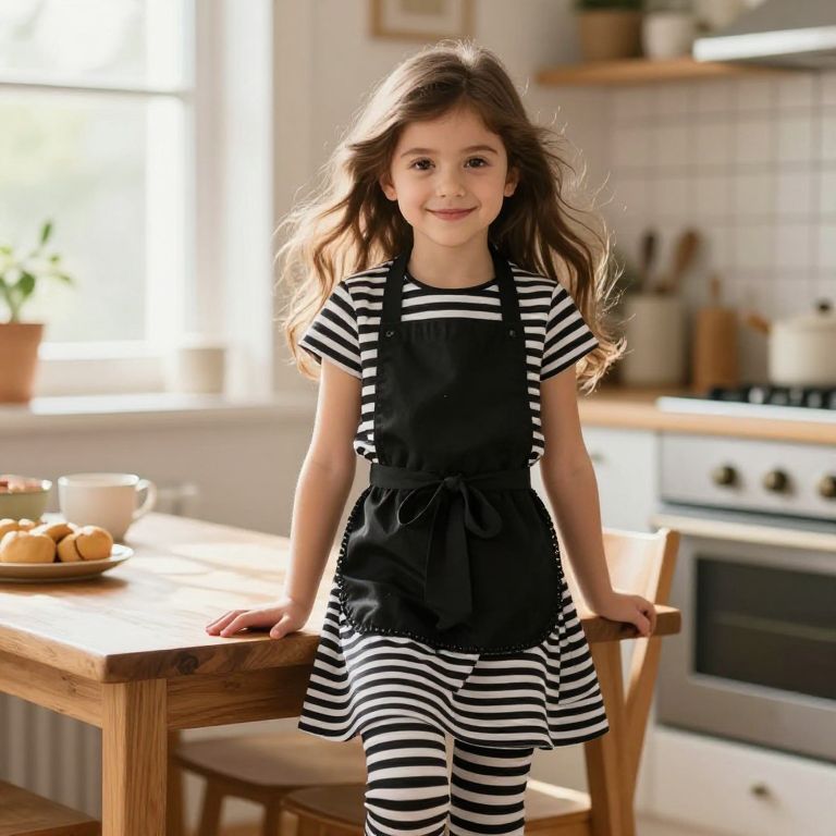 A young girl with long, flowing brown hair, wearing a stylish black and white striped dress with a delicate black apron tied at the waist, paired with matching black and white striped leggings. She stands confidently in a cozy, sunlit kitchen, her hands gently resting on a wooden table, looking directly at the camera with a warm, playful smile. The setting is softly lit with natural daylight streaming through a window, adding a warm, inviting atmosphere.