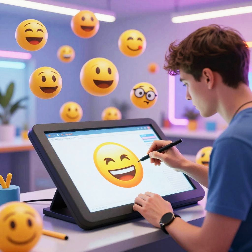 Emoji picture maker, vibrant digital art studio with colorful emoji icons floating around, creative artist crafting custom emoji designs on futuristic touch screen, bright neon lights and playful atmosphere, high detail, cartoon style