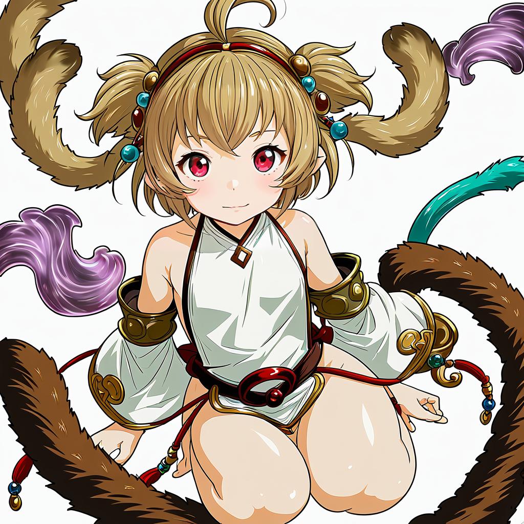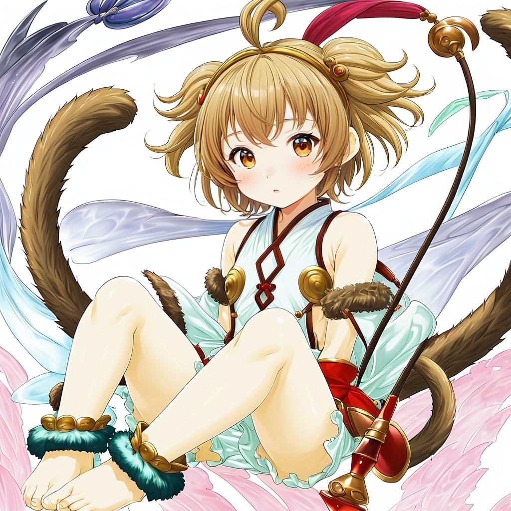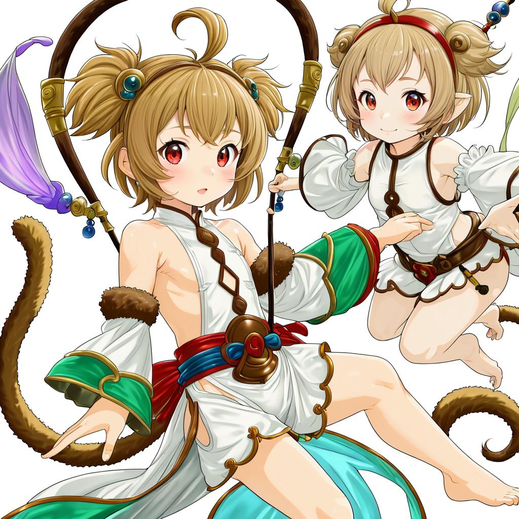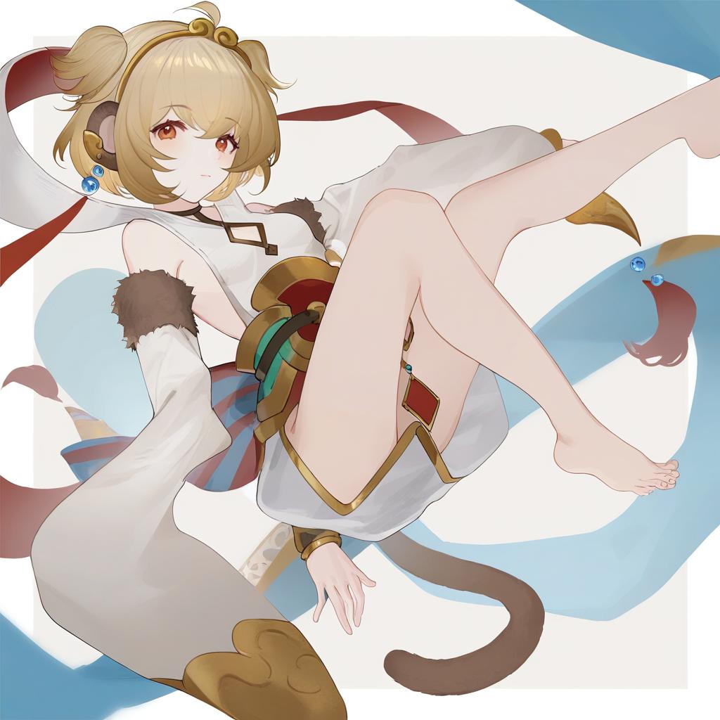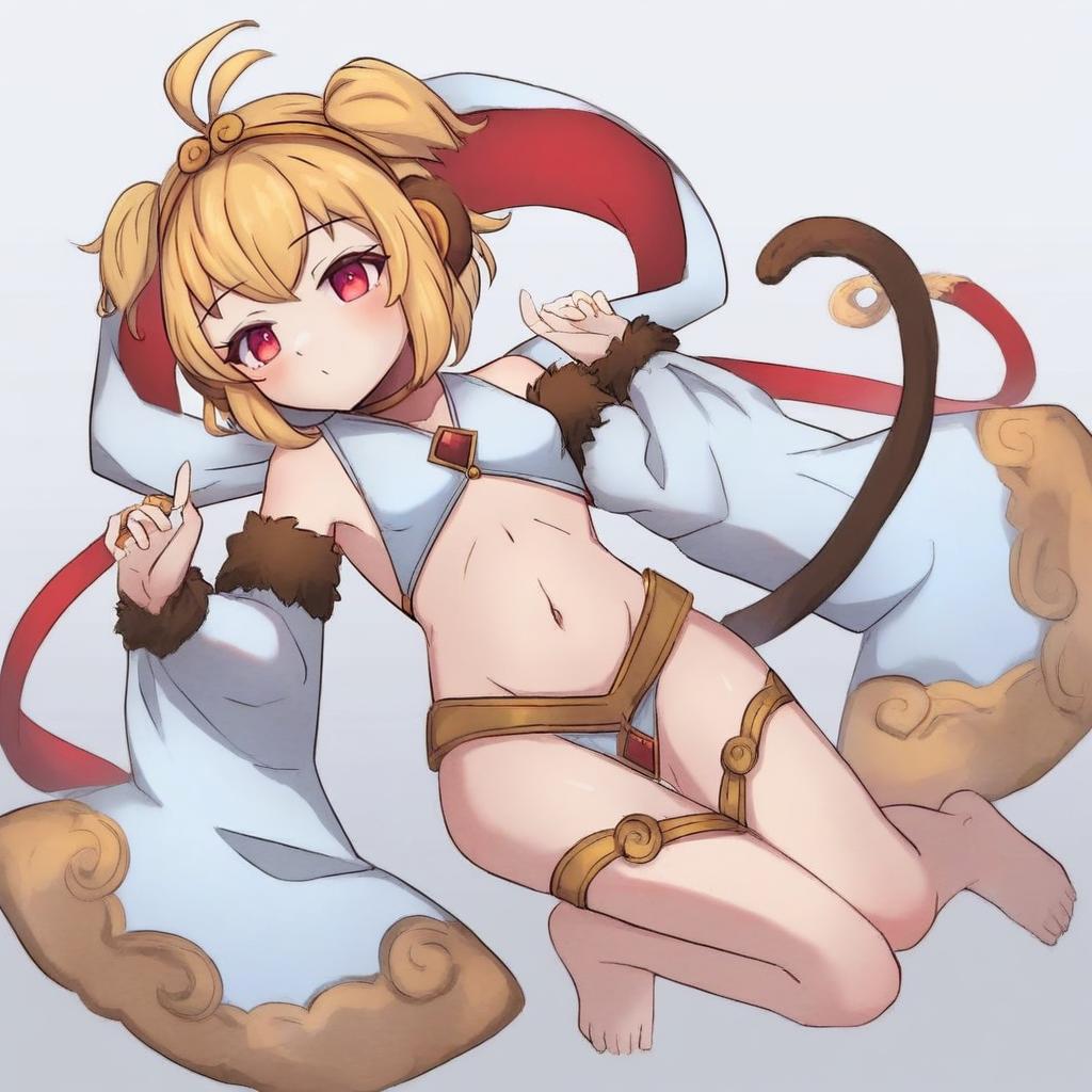 Andira (granblue fantasy), granblue fantasy, 1girl, monkey ears, monkey tail, red eyes, blonde hair, short hair, ahoge, two side up, hairband, small breasts, barefoot, bare shoulders, detached sleeves, erune, by artist fujieda uzuki, anime
