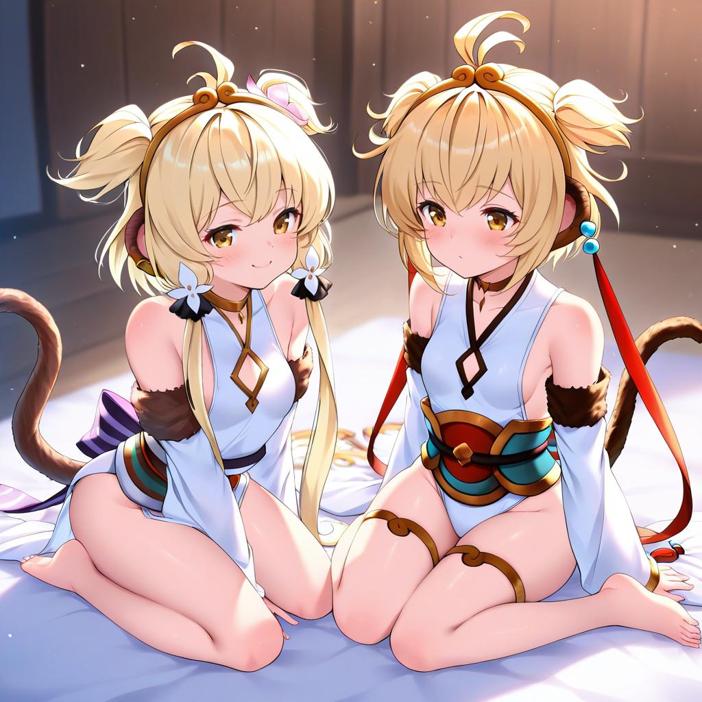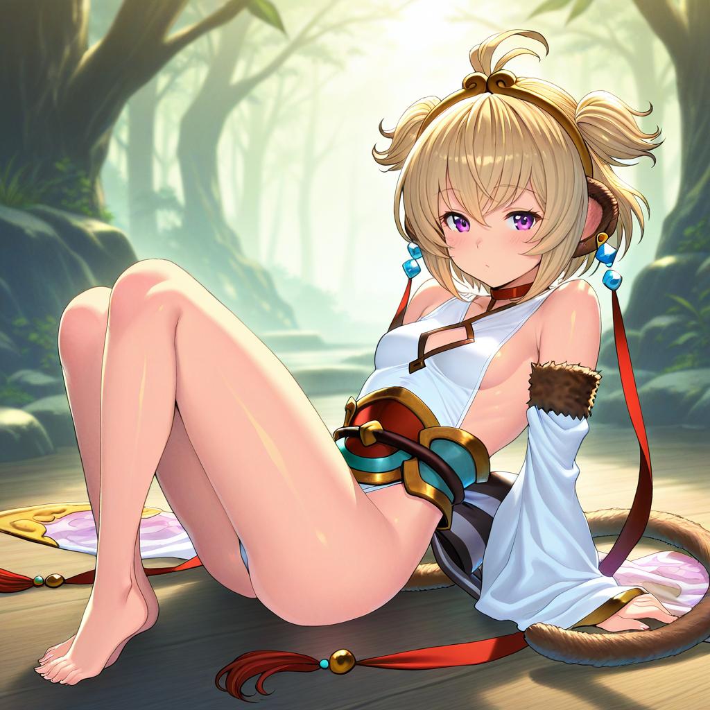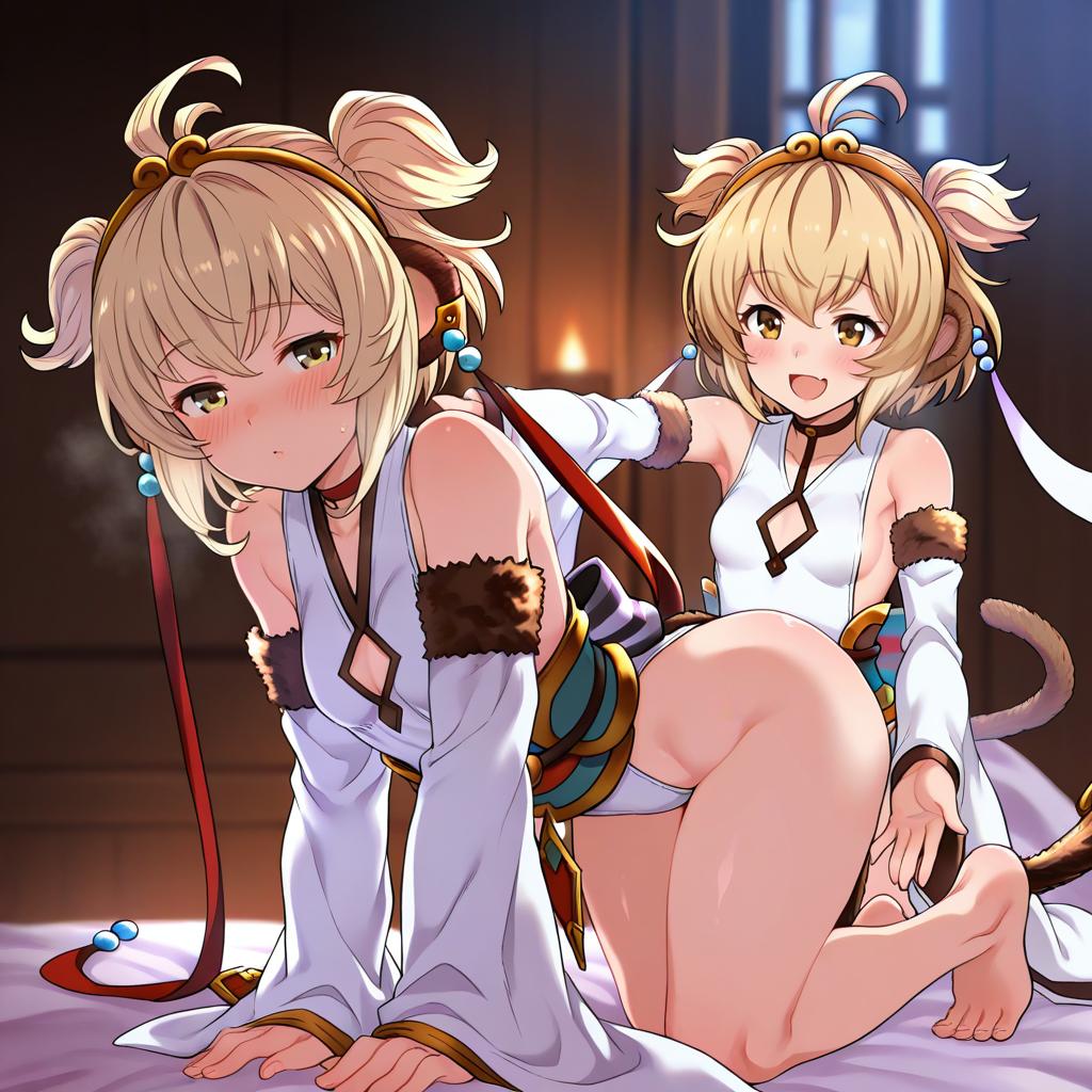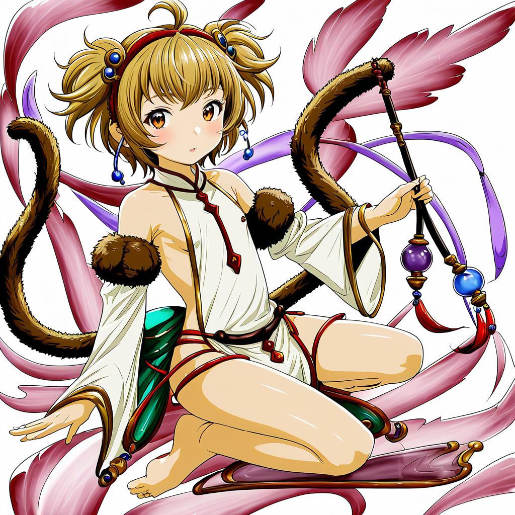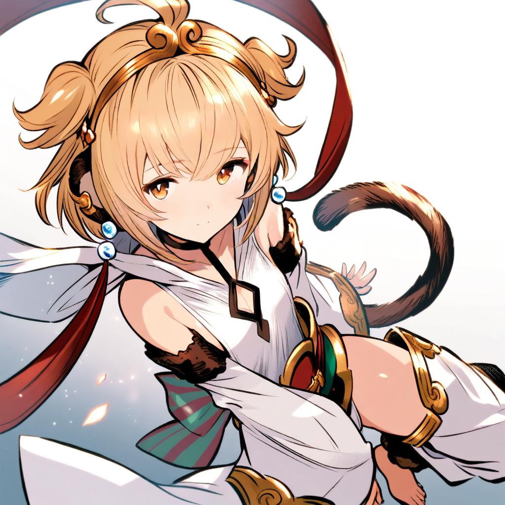 Andira (granblue fantasy), granblue fantasy, 1girl, monkey ears, monkey tail, red eyes, blonde hair, short hair, ahoge, two side up, hairband, small breasts, barefoot, bare shoulders, detached sleeves, erune, by artist fujieda uzuki, anime