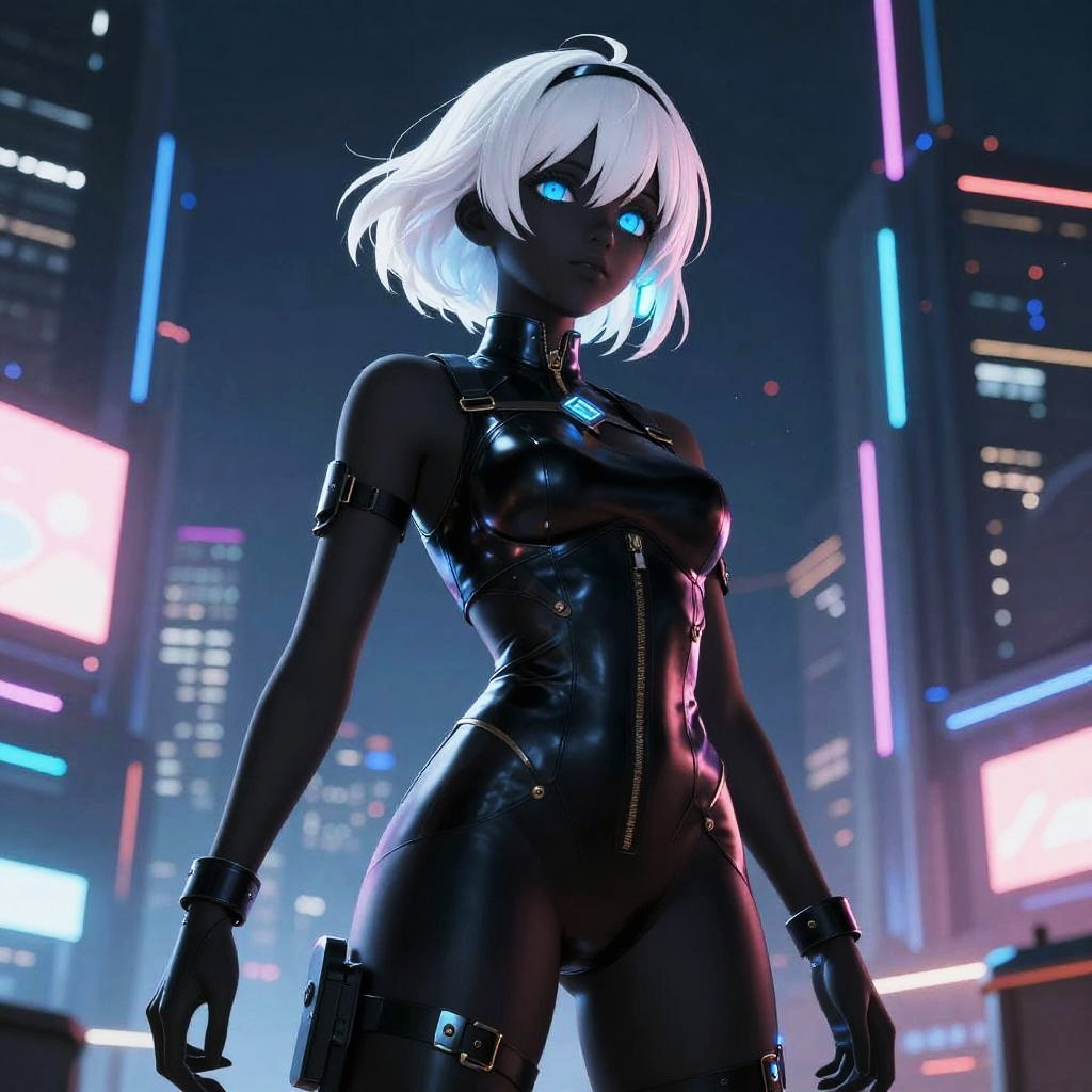 Black anime girl with white hair, standing in a futuristic cityscape at night, glowing neon lights reflecting on her sleek outfit and sharp eyes, dynamic pose, detailed background.