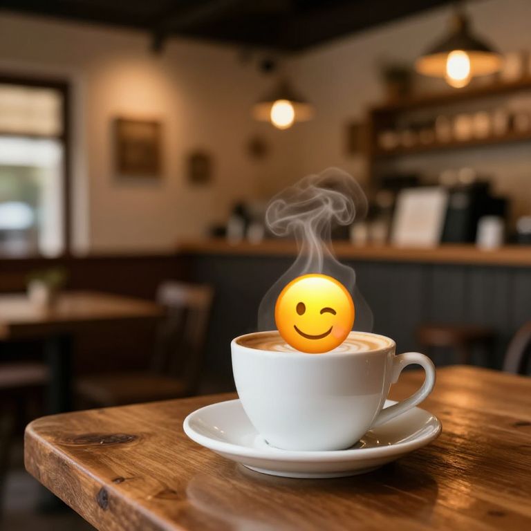 Add an emoji to a photo of a cozy coffee shop interior, warm lighting, rustic decor, with a subtle winking emoji placed on the steaming cup of coffee, creating a friendly and inviting atmosphere, soft focus background.