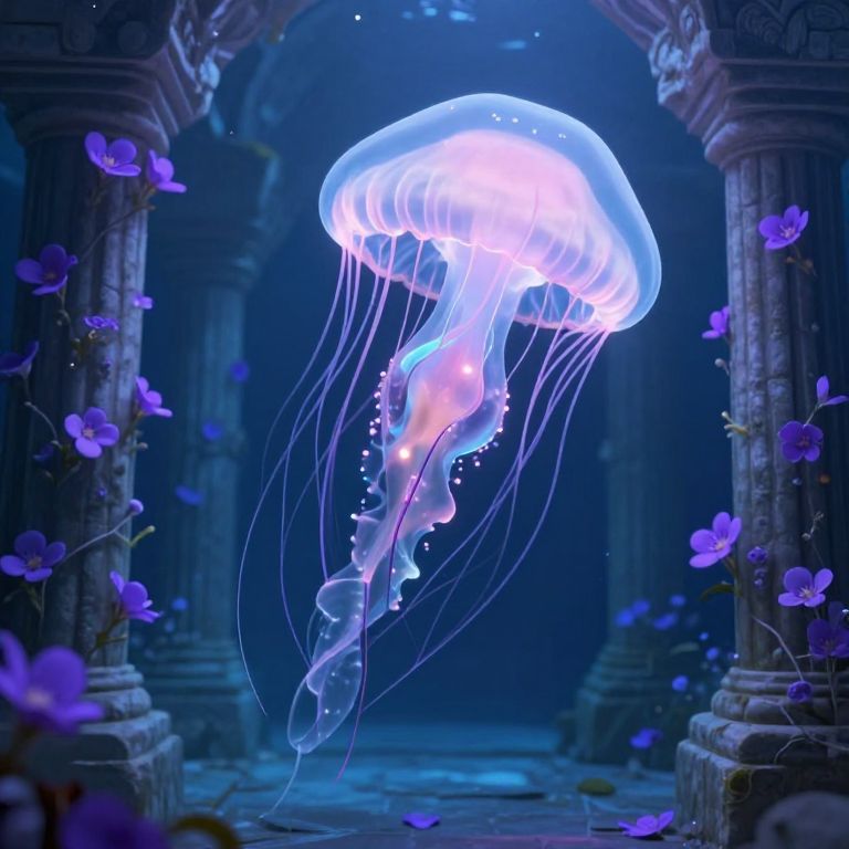 Photorealistic digital CGI image of a glowing blue and purple jellyfish with translucent, umbrella-shaped bell and long, trailing tentacles. It floats in an ancient, dimly lit stone ruin adorned with purple flowers. The background is a deep blue, with ethereal light illuminating the jellyfish. The stone columns, weathered and textured, frame the jellyfish, creating a mystical underwater scene. The jellyfish's bioluminescent glow contrasts beautifully with the dark, mysterious surroundings.