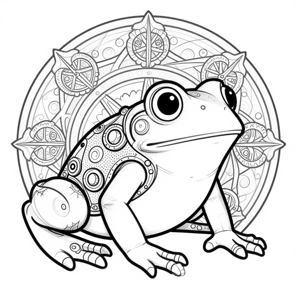 "Comic Strip Mandala style Steampunk Victorian Frog, colorless coloring page for coloring book for adult coloring book, clear with thick bold black lines, detailed, high resolution, outline only,"