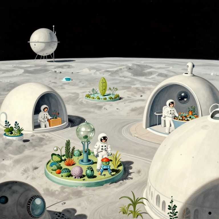 1950s space art illustrating a peaceful moon colony with domed habitats and astronauts tending to futuristic gardens, optimistic and hopeful atmosphere, clean lines and pastel hues characteristic of mid-century space age imagery