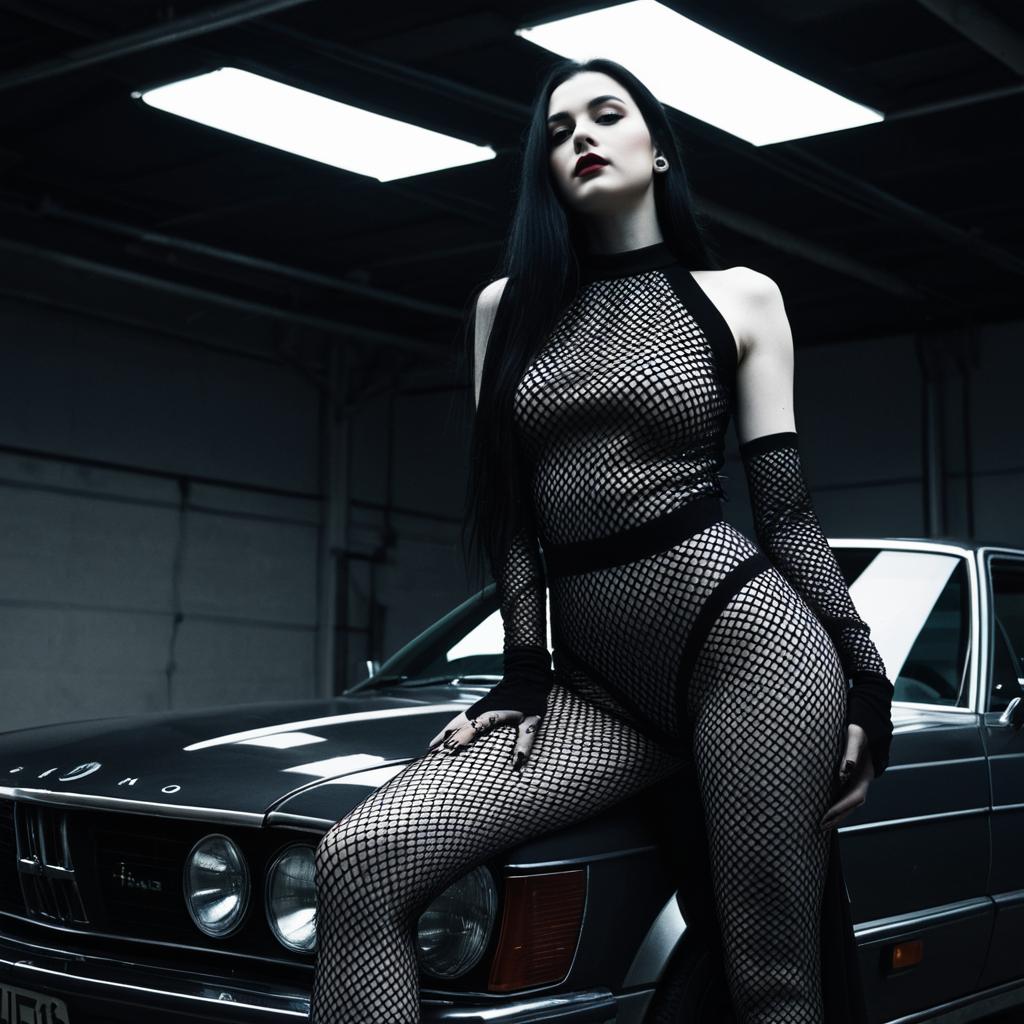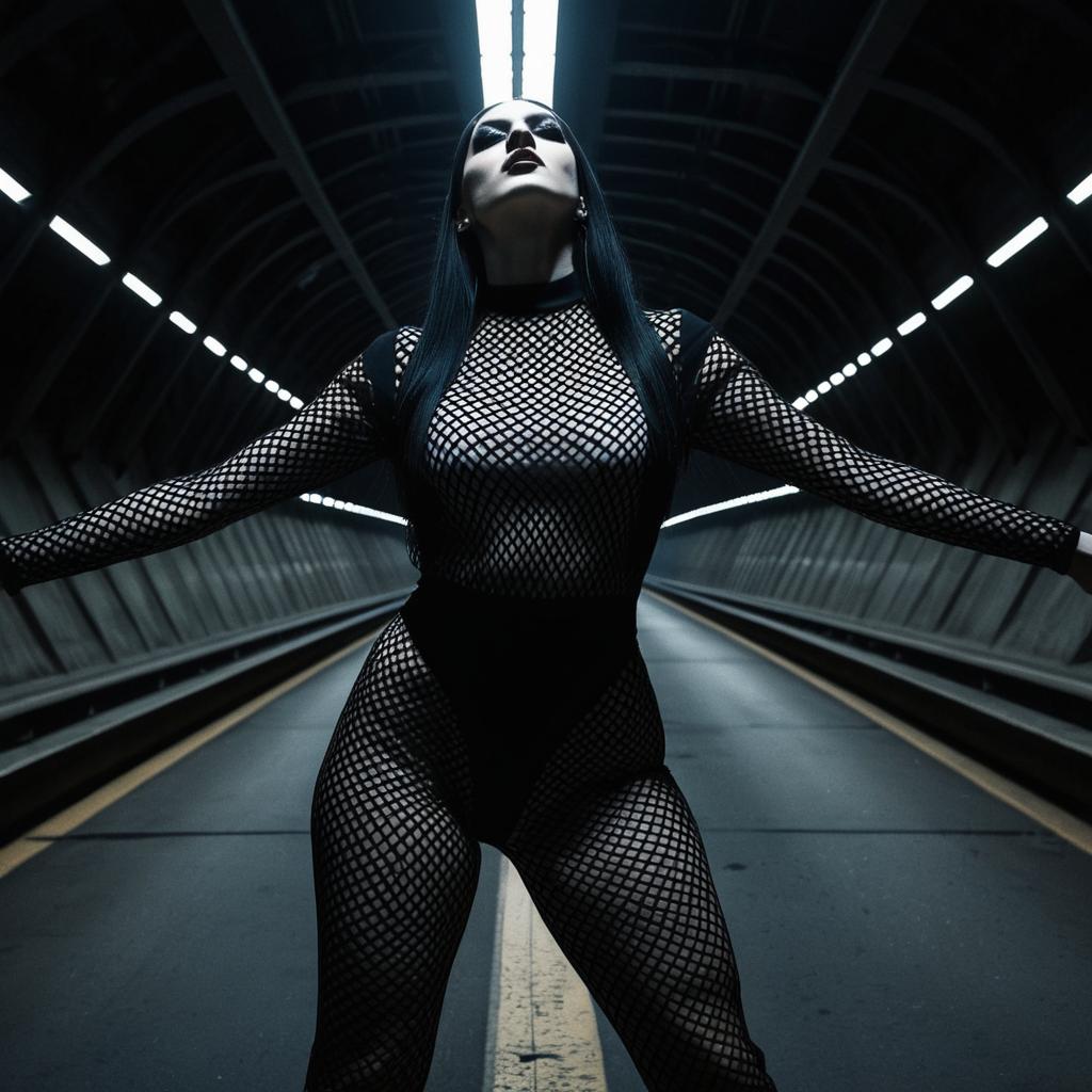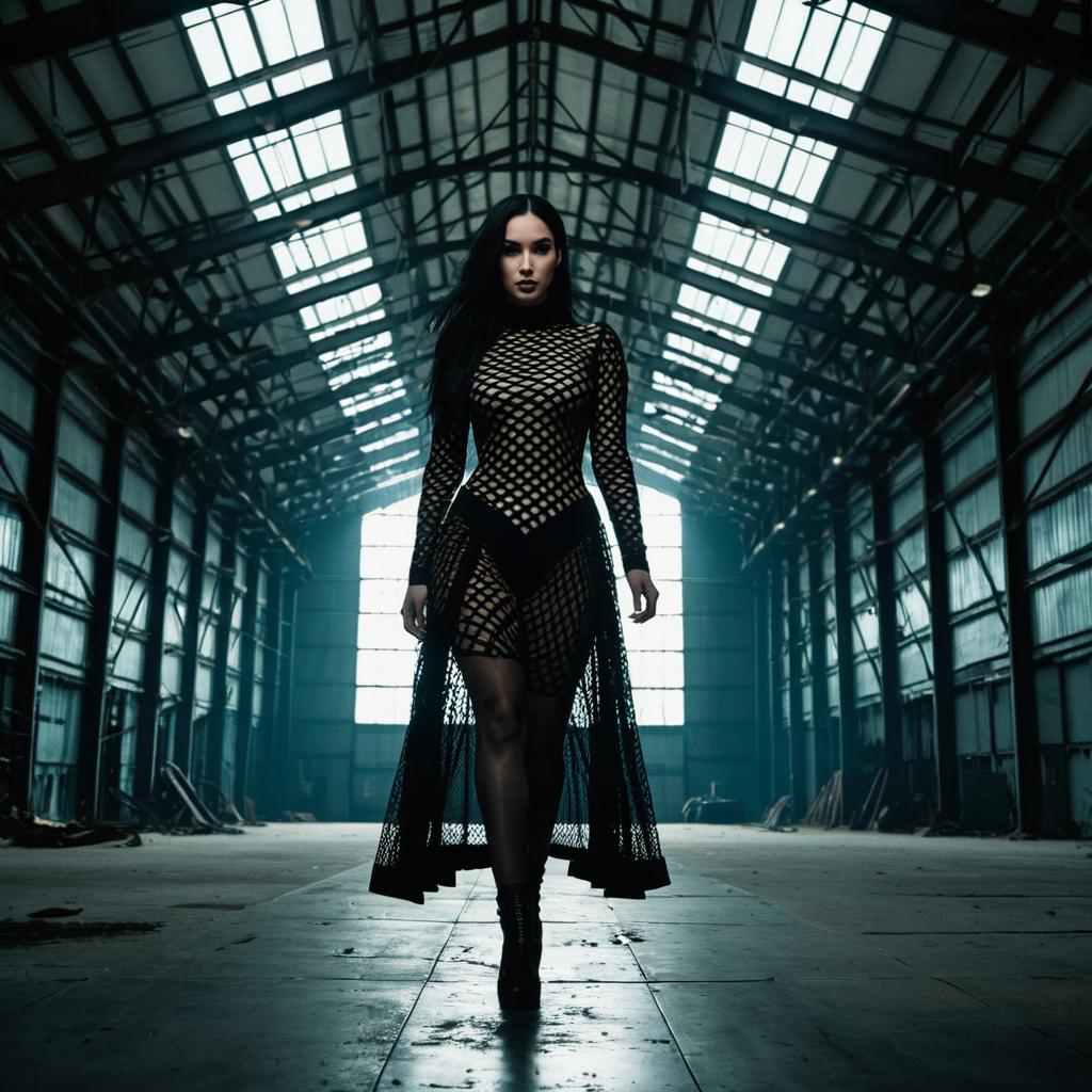 Woman in Sheer Fishnet Gothic Dress in Abandoned Hangar