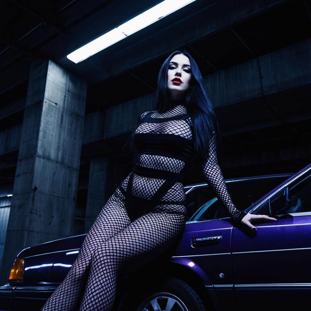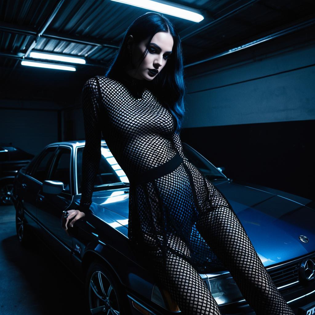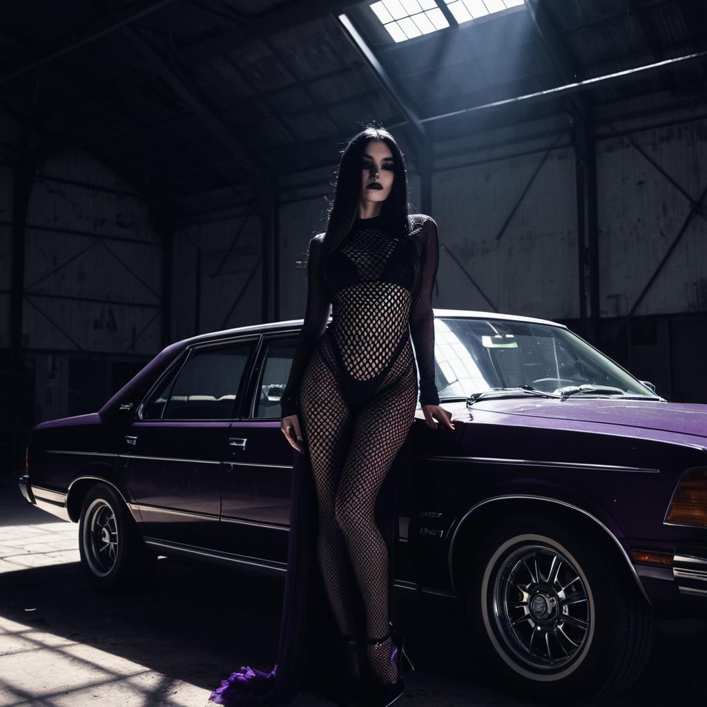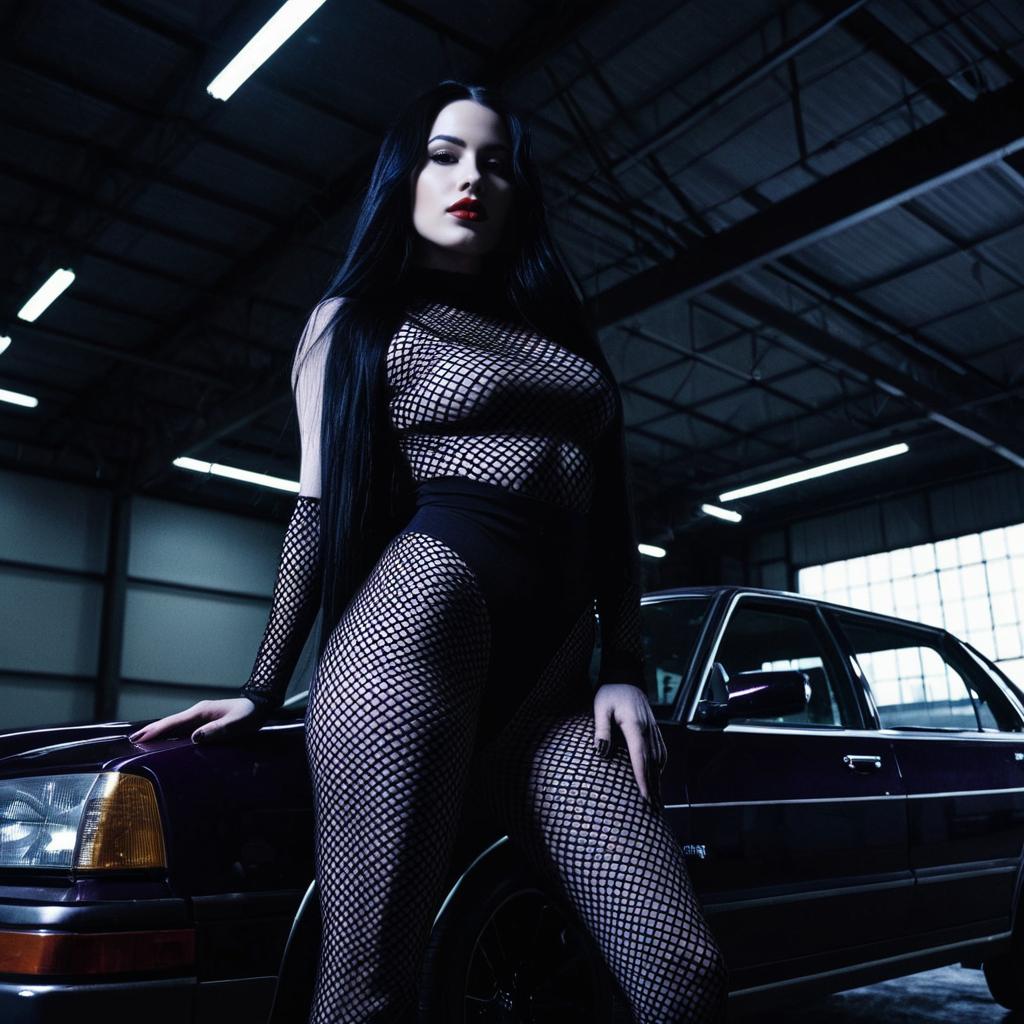 Woman in Sheer Fishnet Gothic Dress in Abandoned Hangar