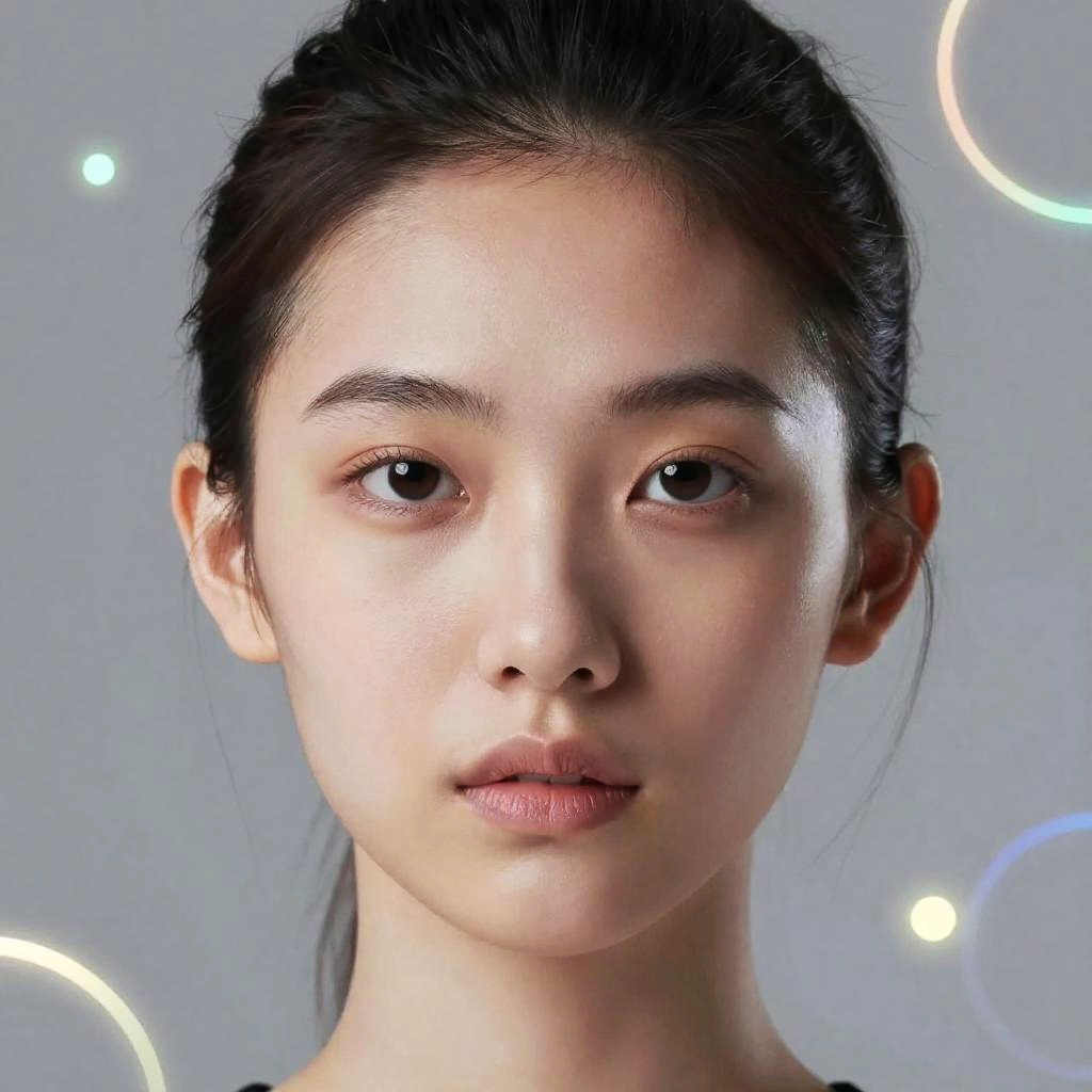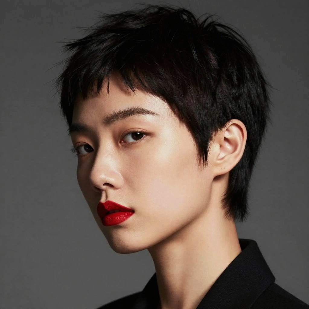Photorealistic portrait of an Asian woman with short, spiky black hair, fair skin, red lipstick, and black clothing, against a gray background